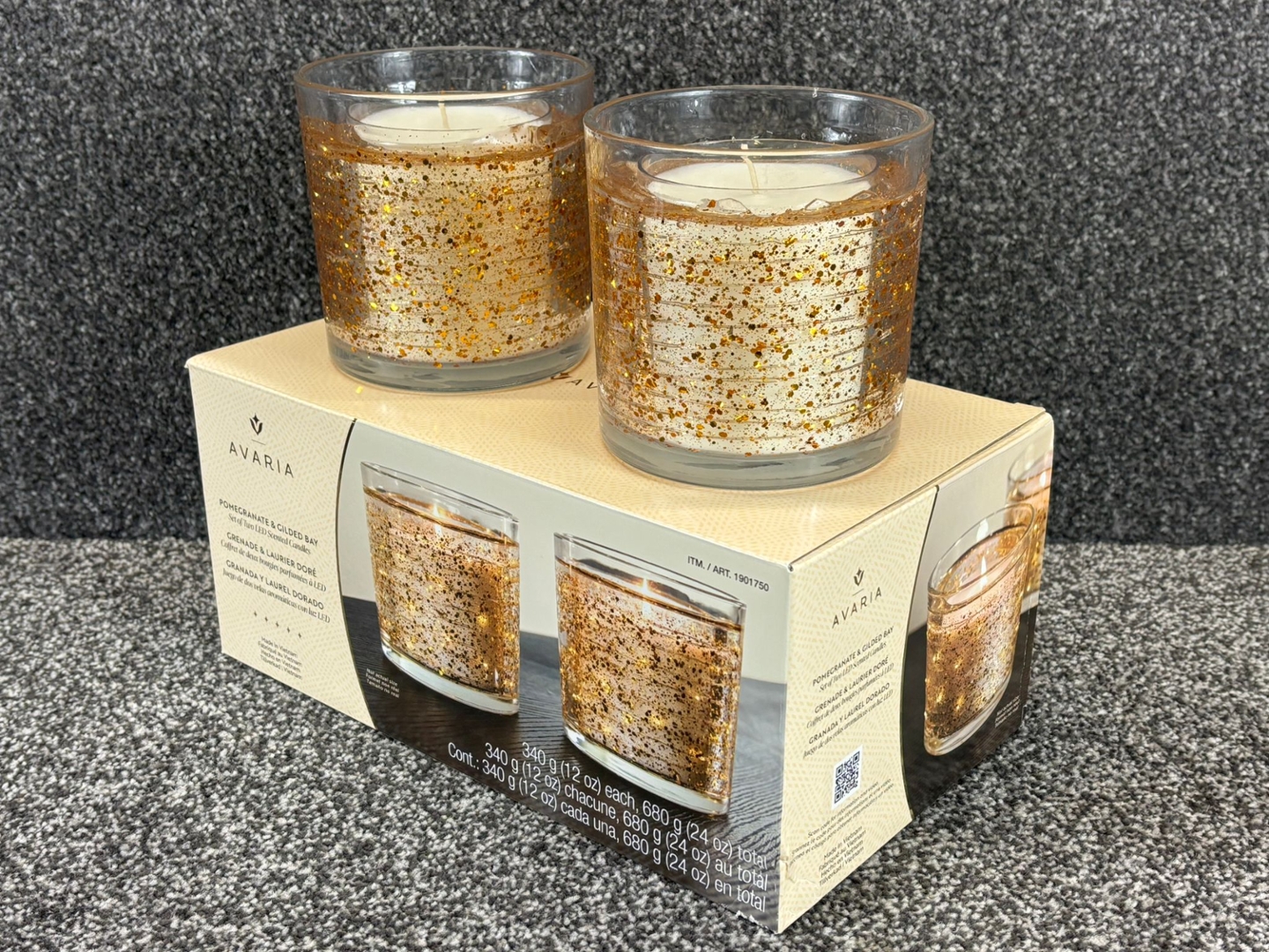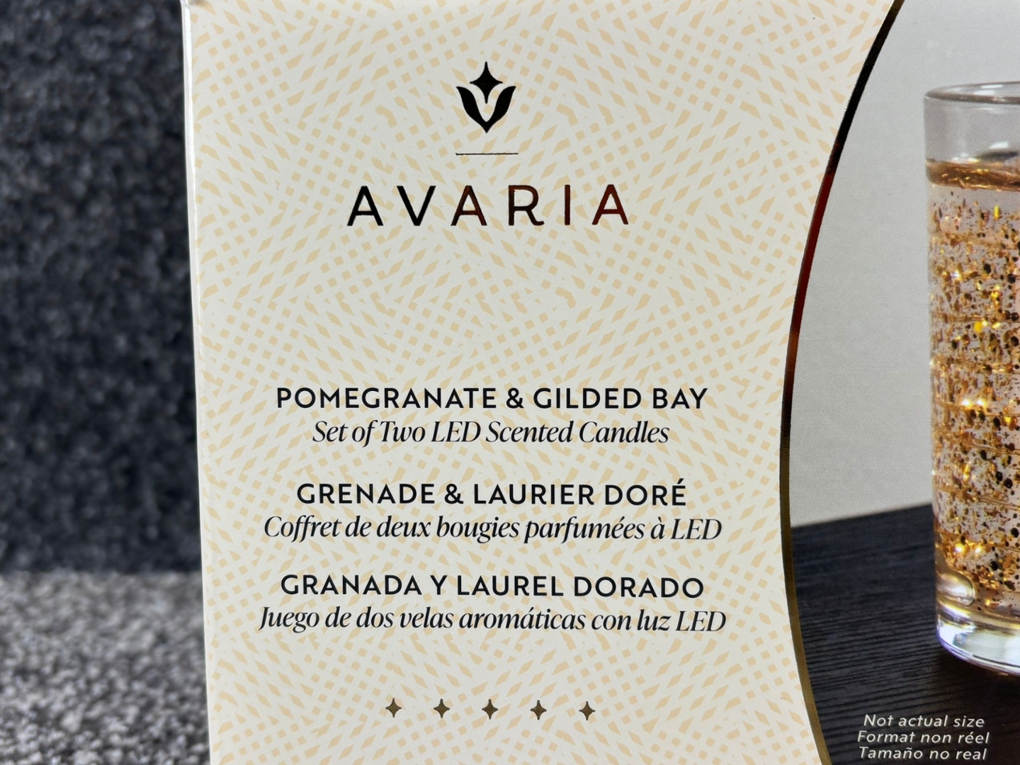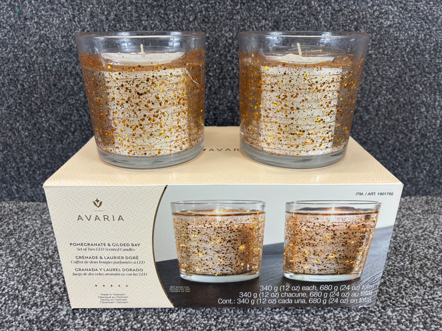 A set of 2 Avaria Sparkling LED Candles - Pomegranate & Gilded Bay. 2 x 340g