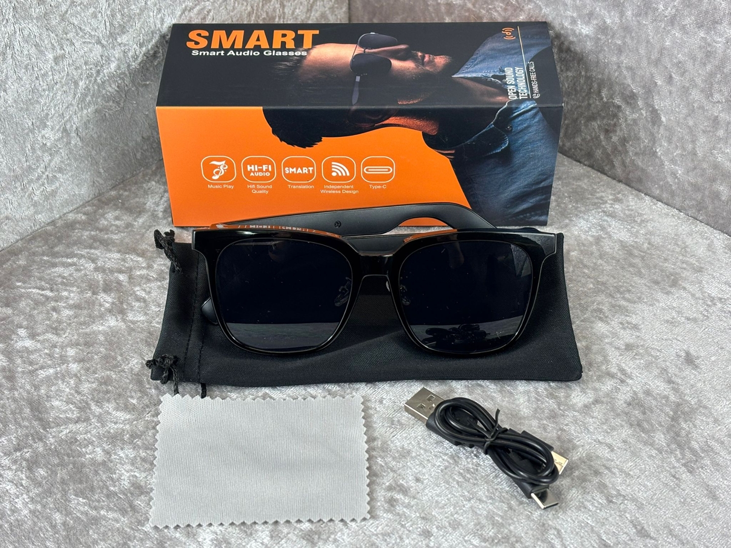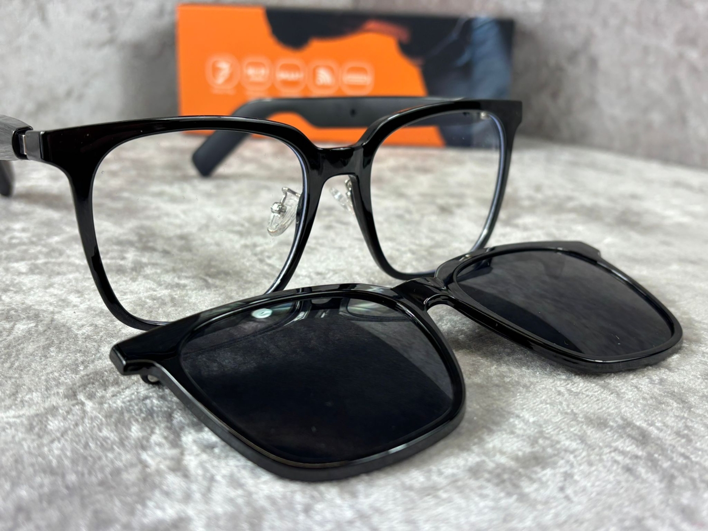 A brand new, unused and boxed pair of smart interchangeable glasses and sunglasses, combining a classic frame design with hands-free audio, built-in call functionality, open-ear sound, and simple lens swapping for seamless everyday and outdoor use.