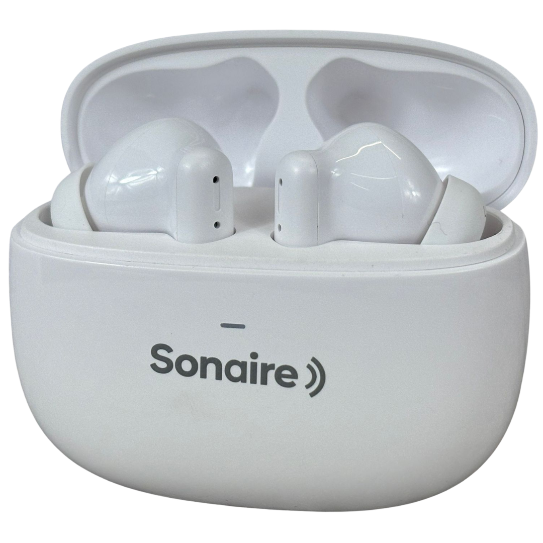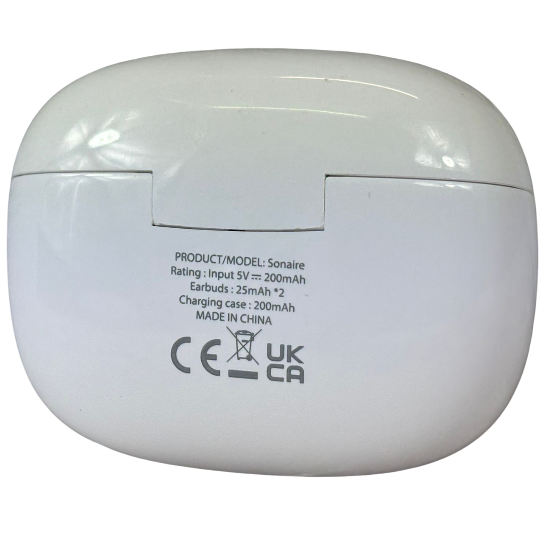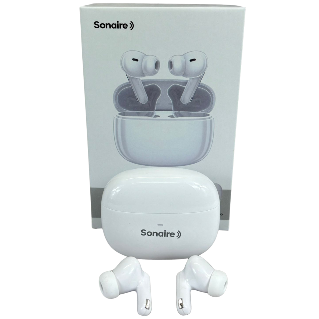 A brand new Sonaire wireless earbuds set in a clean white finish, offering a sleek and contemporary design paired with everyday functionality. Presented in a compact charging case, these earbuds deliver a comfortable in-ear fit, making them ideal for extended listening whether at home, commuting, or on the move.