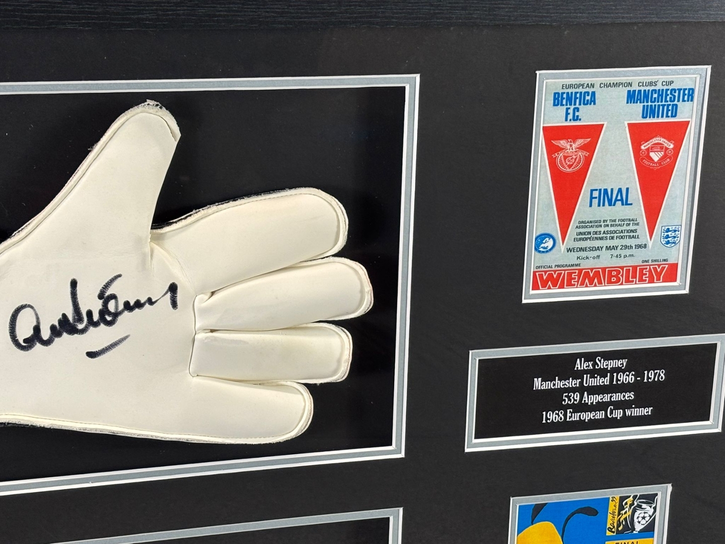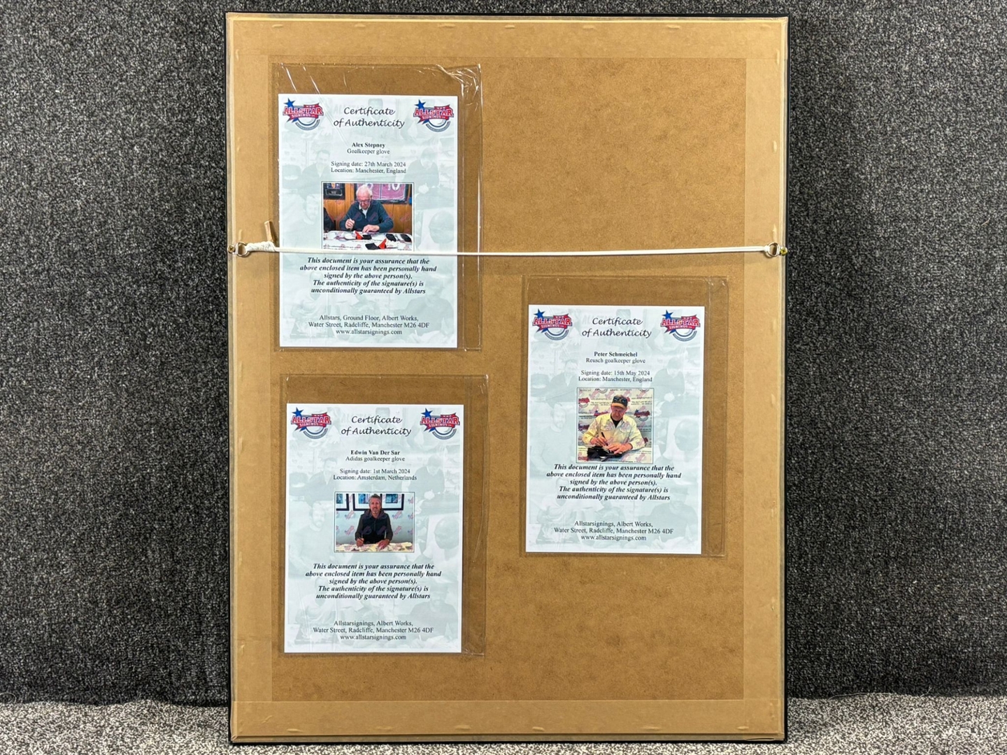 A collection of the three Man United Goalkeepers to win the Champions League, signed and authenticated Alex Stepney, Peter Schmeichel & Edwin Van der Sar Goalkeepers' Gloves in a presentation frame. Approx 87cm height, 67cm width.