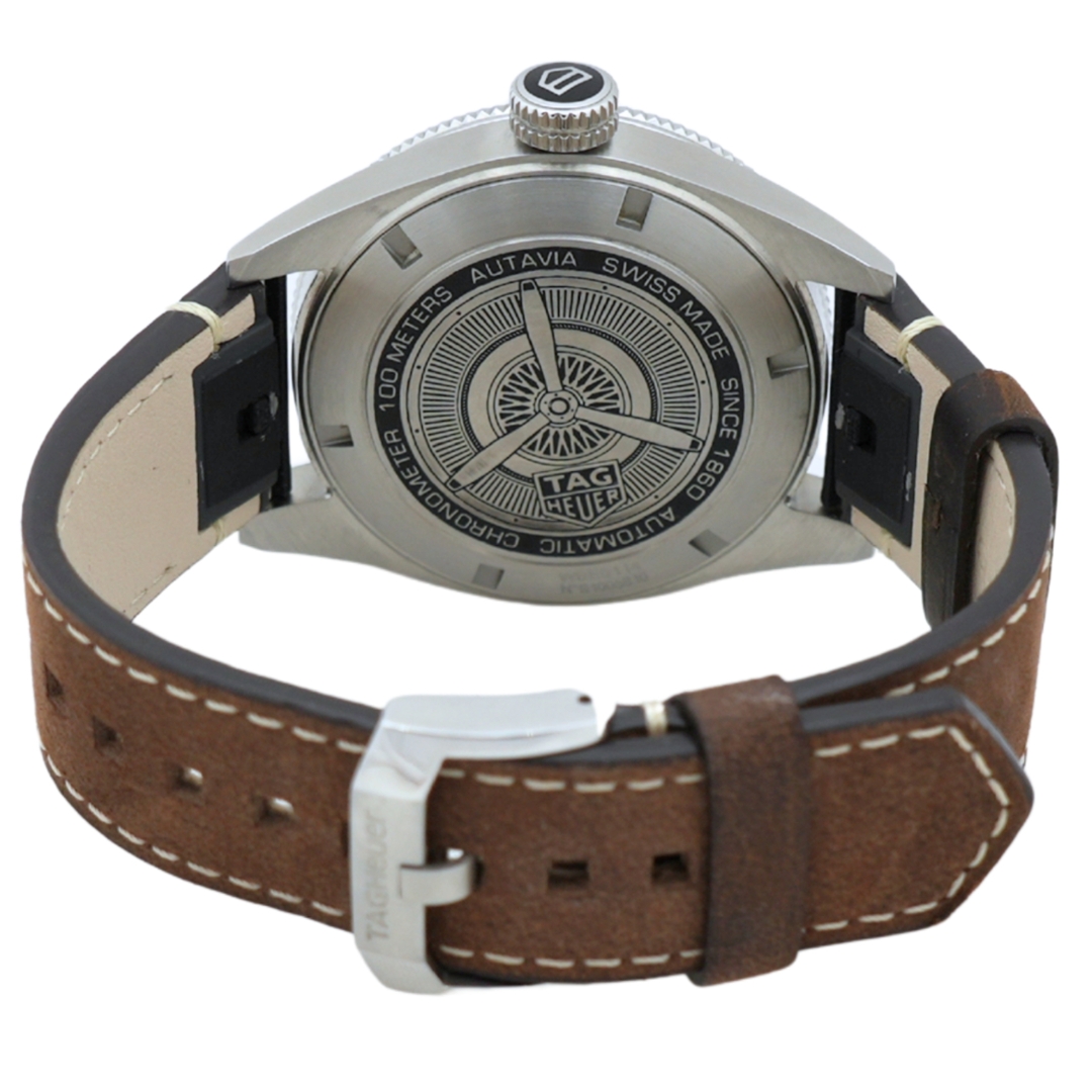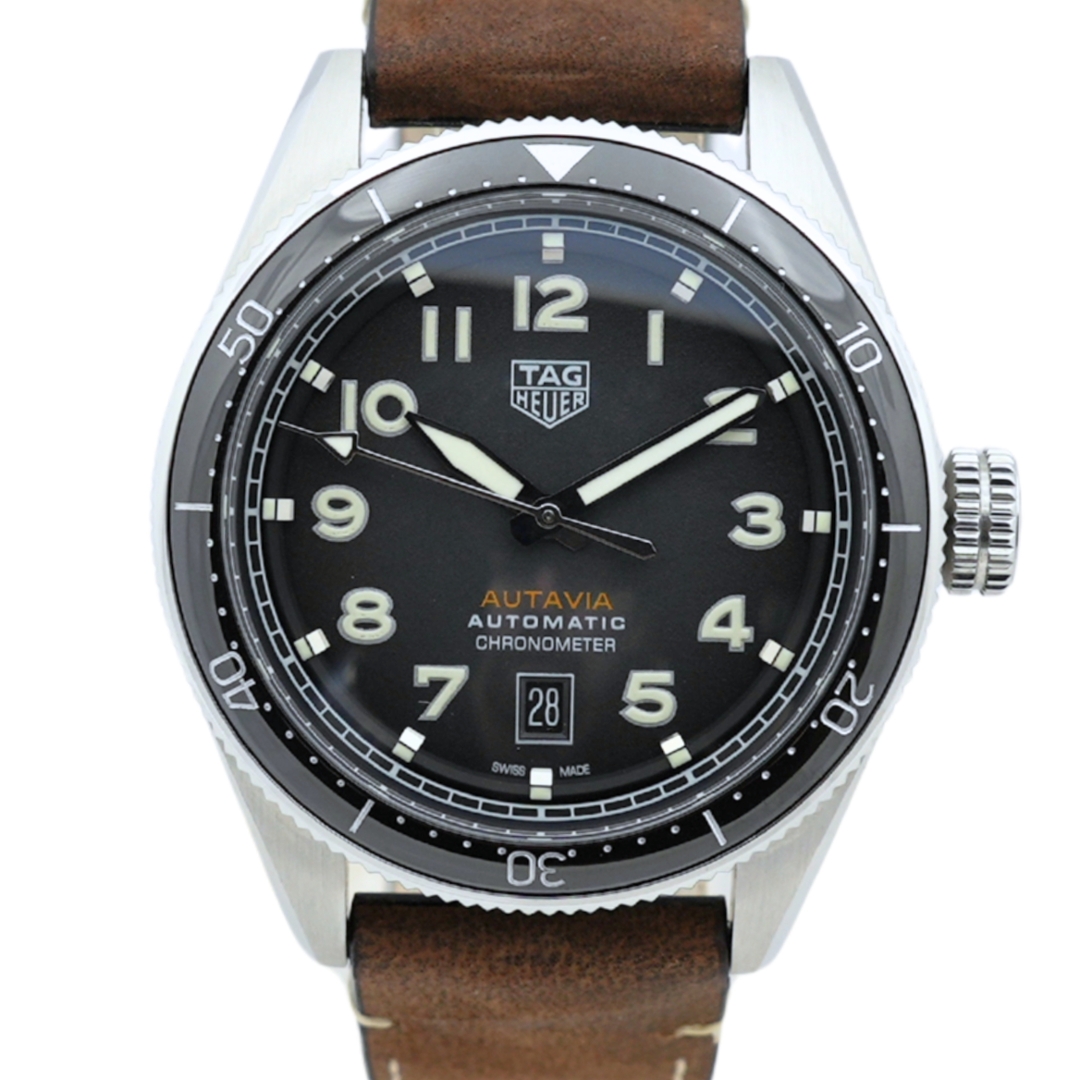 A Tag Heuer Autavia reference WBE5114, presented on a brown leather strap with a stainless steel case and clasp, featuring a black dial and matching black bezel. Inspired by the brand’s historic aviation and motorsport heritage, the Autavia collection blends vintage design cues with modern engineering. The bold Arabic numerals and luminous hands ensure excellent legibility, while the clean black dial and rotating bezel create a purposeful and balanced aesthetic. The 42mm stainless steel case offers a strong yet versatile presence on the wrist, perfectly complemented by the rich brown leather strap, which enhances the watch’s classic tool-watch character.