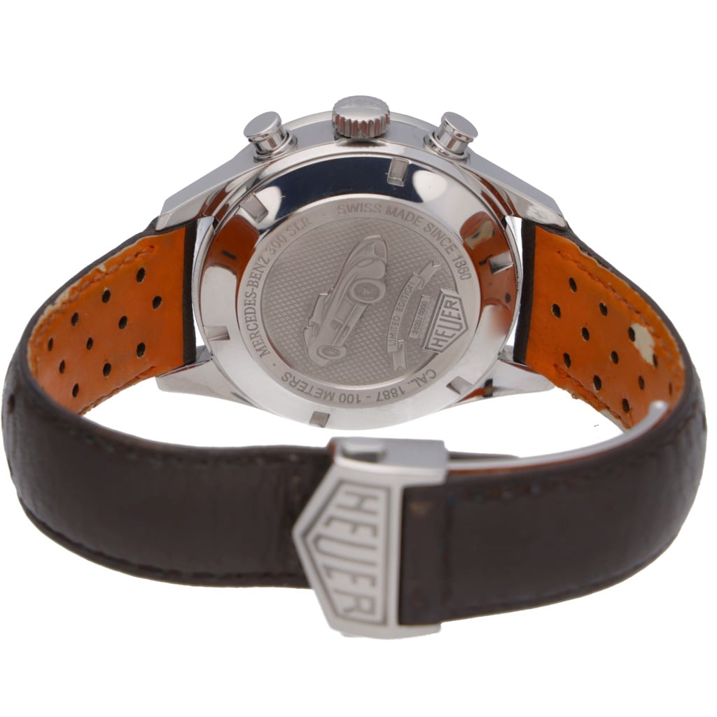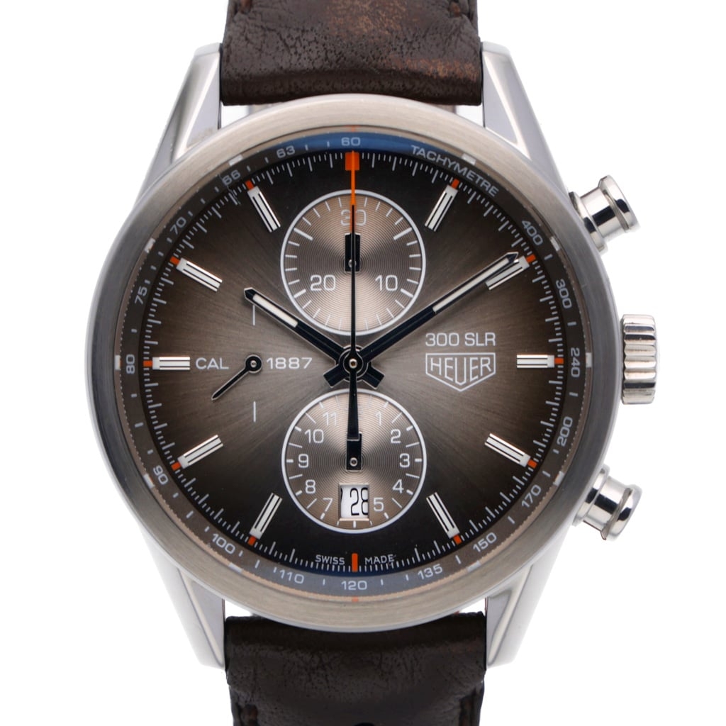 The grey sunburst dial features contrasting silver chronograph sub-dials, a central chronograph seconds hand with orange detailing, and a tachymeter scale for added functionality. The “300 SLR” marking pays tribute to Mercedes-Benz's racing history, reinforcing the model’s automotive connection. The brown leather strap complements the dial tones while maintaining a refined yet sporty aesthetic. Powering the watch is the TAG Heuer Calibre 1887 automatic chronograph movement, offering column-wheel architecture and reliable performance.