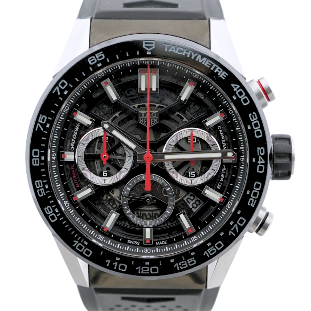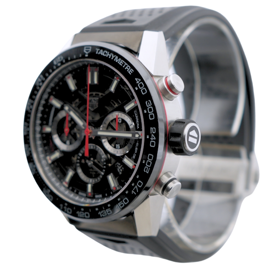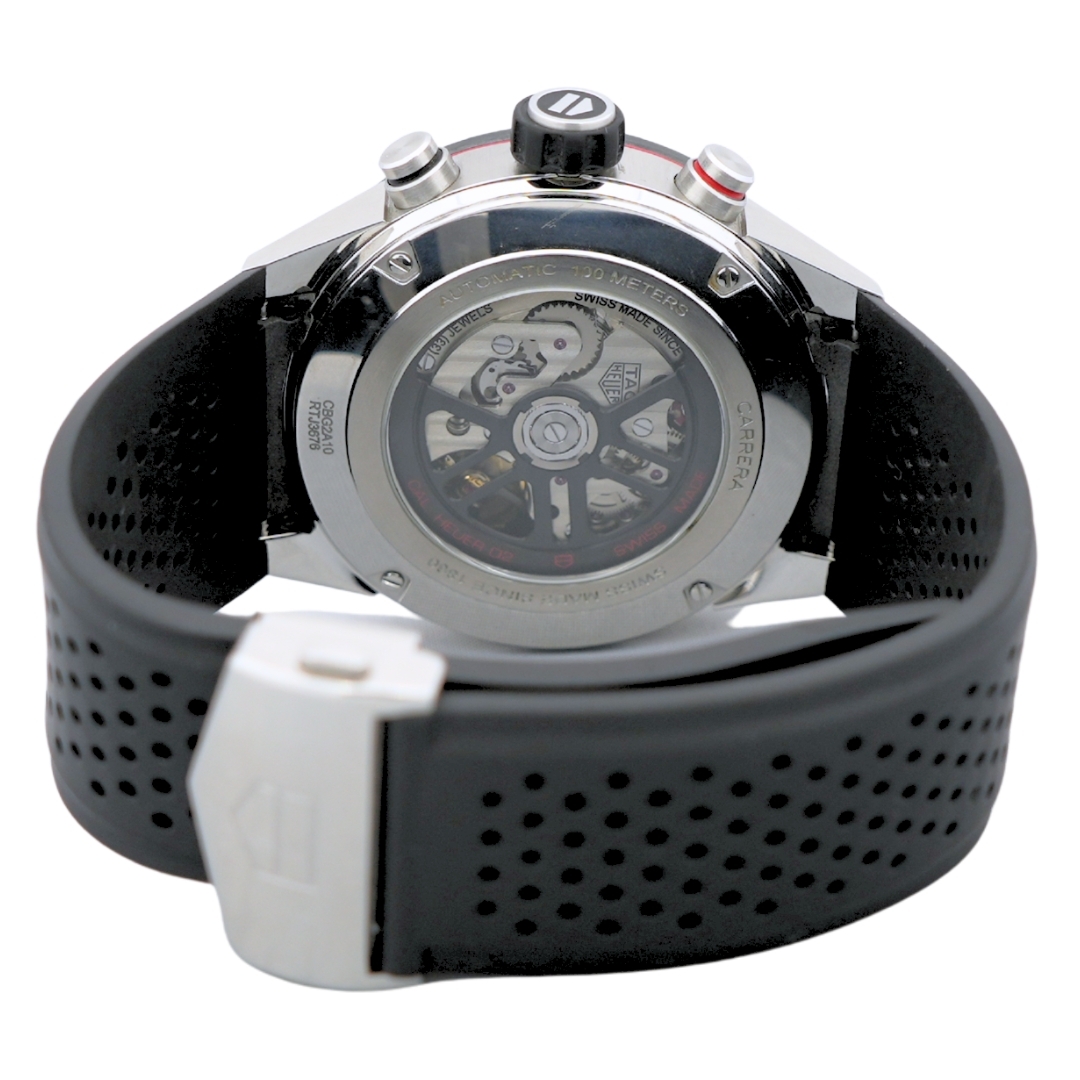 The open-worked dial reveals the intricacies of the movement, with three sub-dials providing chronograph functionality at 3, 6, and 9 o’clock, framed by red accents for a sporty aesthetic. The tachymetre scale on the bezel enhances its motorsport-inspired heritage, making this Carrera both an accurate tool watch and a statement piece. Luminescent hands and hour markers ensure visibility in all conditions, while the sapphire crystal caseback offers a view of the finely engineered calibre within.