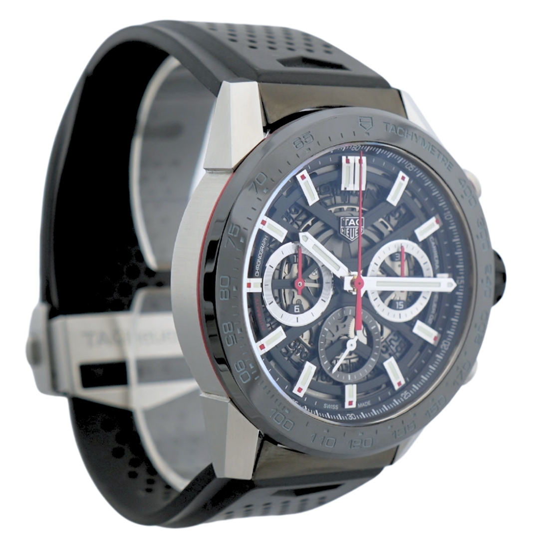 A Tag Heuer Carrera Watch, presented on a robust black rubber strap with a stainless steel case and clasp, showcases a striking black ceramic bezel and skeleton dial. This bold 45mm chronograph is powered by Tag Heuer’s in-house calibre Heuer 02 automatic movement, offering an impressive 80-hour power reserve and a column wheel chronograph mechanism for smooth precision.