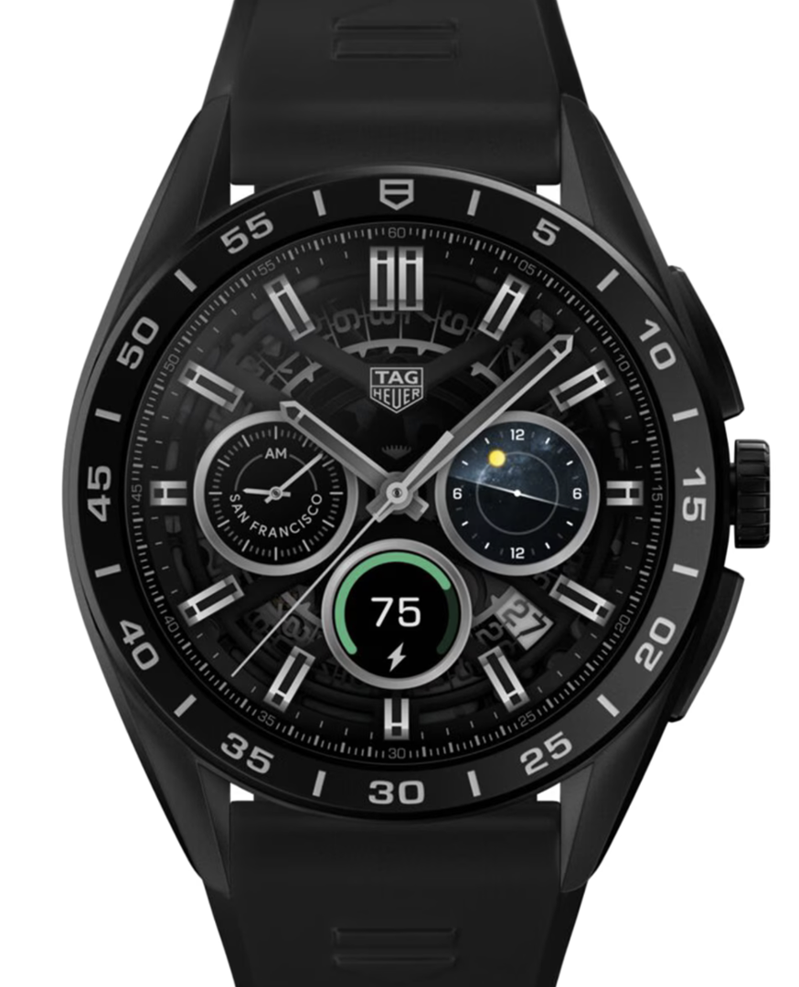 A Tag Heuer Connected is a cutting-edge smartwatch that blends Swiss luxury with advanced technology, delivering high-performance functionality and timeless design. This 2021 model, featuring a lightweight yet durable titanium case, is complemented by a sleek black ceramic bezel, exuding a bold and modern aesthetic. The black rubber strap ensures comfort and durability, perfect for all-day wear. With a 45mm case size, this smartwatch offers a commanding wrist presence while maintaining a streamlined and ergonomic fit.