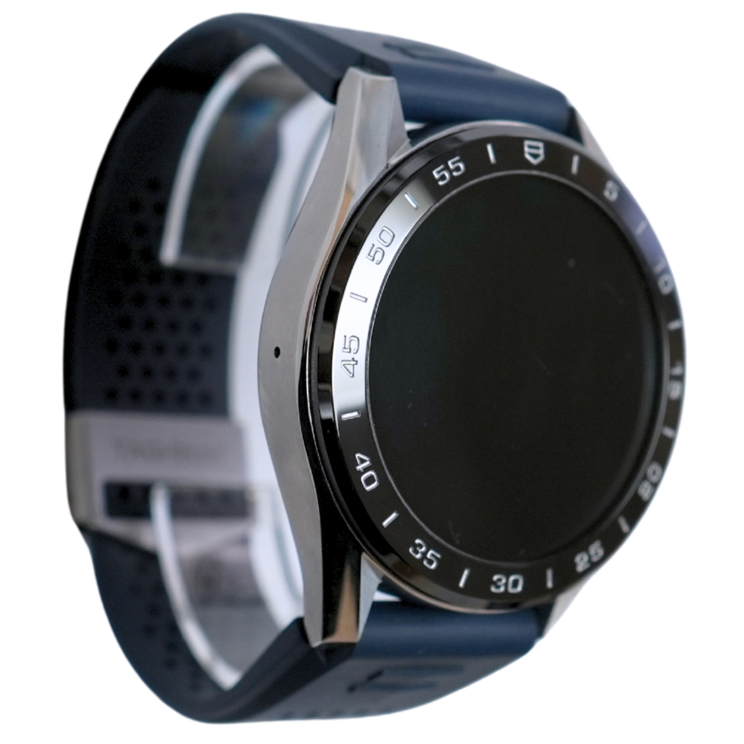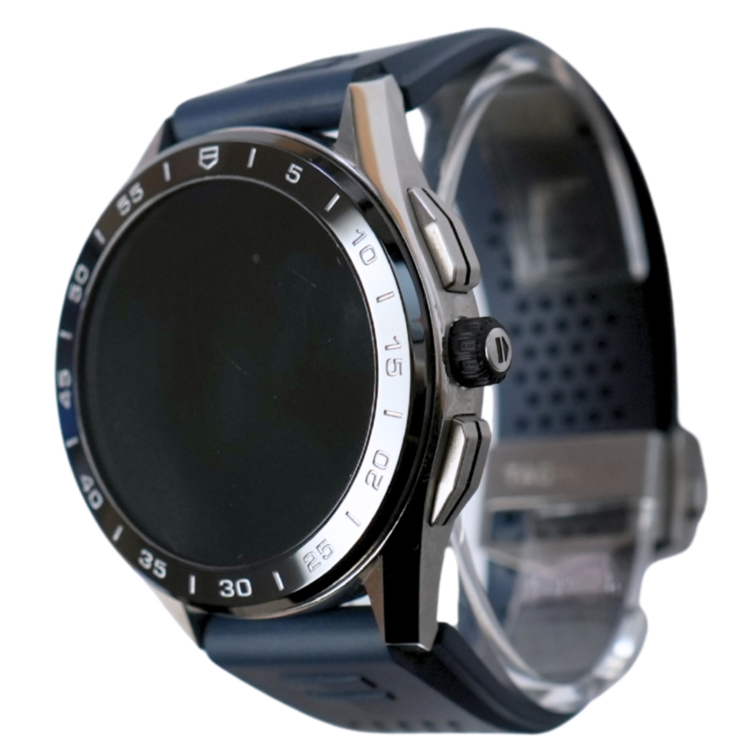 A Tag Heuer Connected Watch, reference SBG8A10, featuring an aftermarket blue rubber strap, a stainless steel case and clasp, and a black ceramic bezel. Measuring 45mm, this model houses Tag Heuer’s advanced Connected digital smartwatch technology, offering a range of performance tracking, connectivity, and display customisation features.