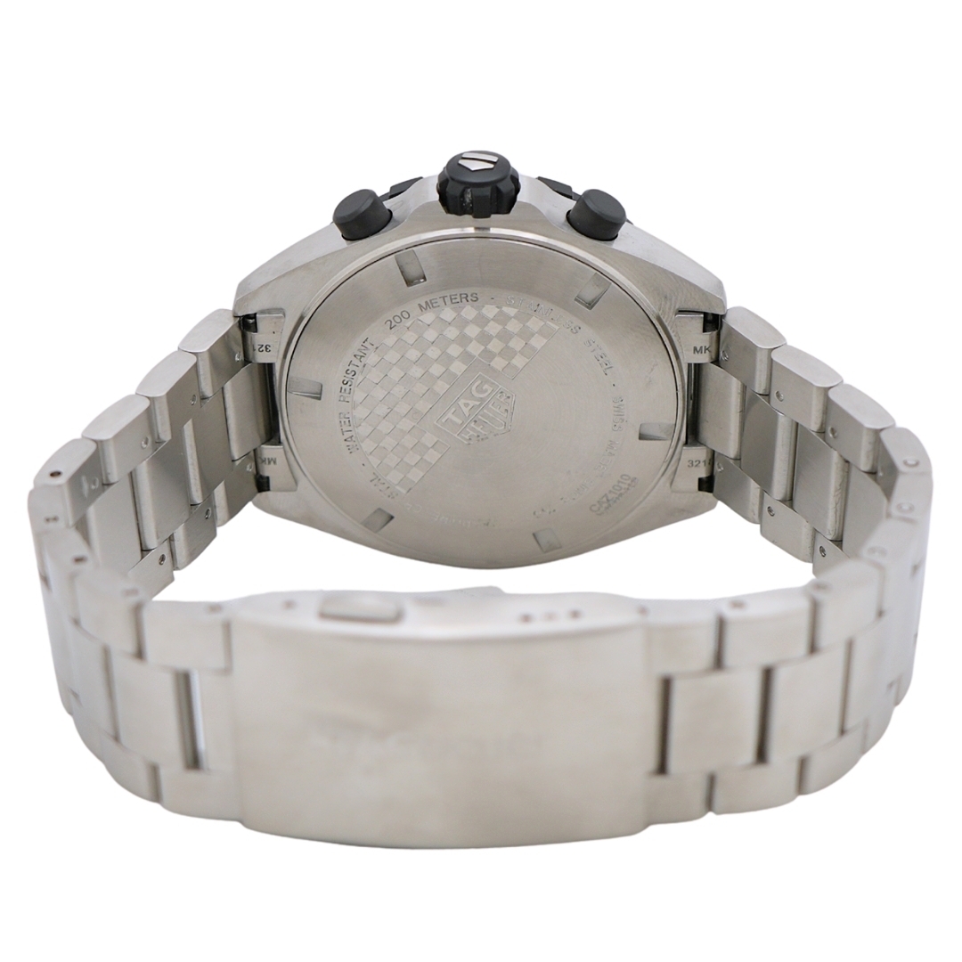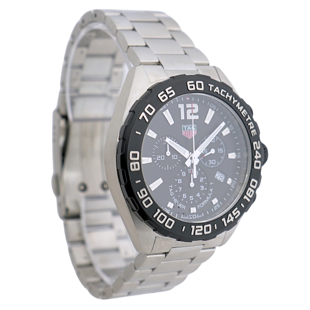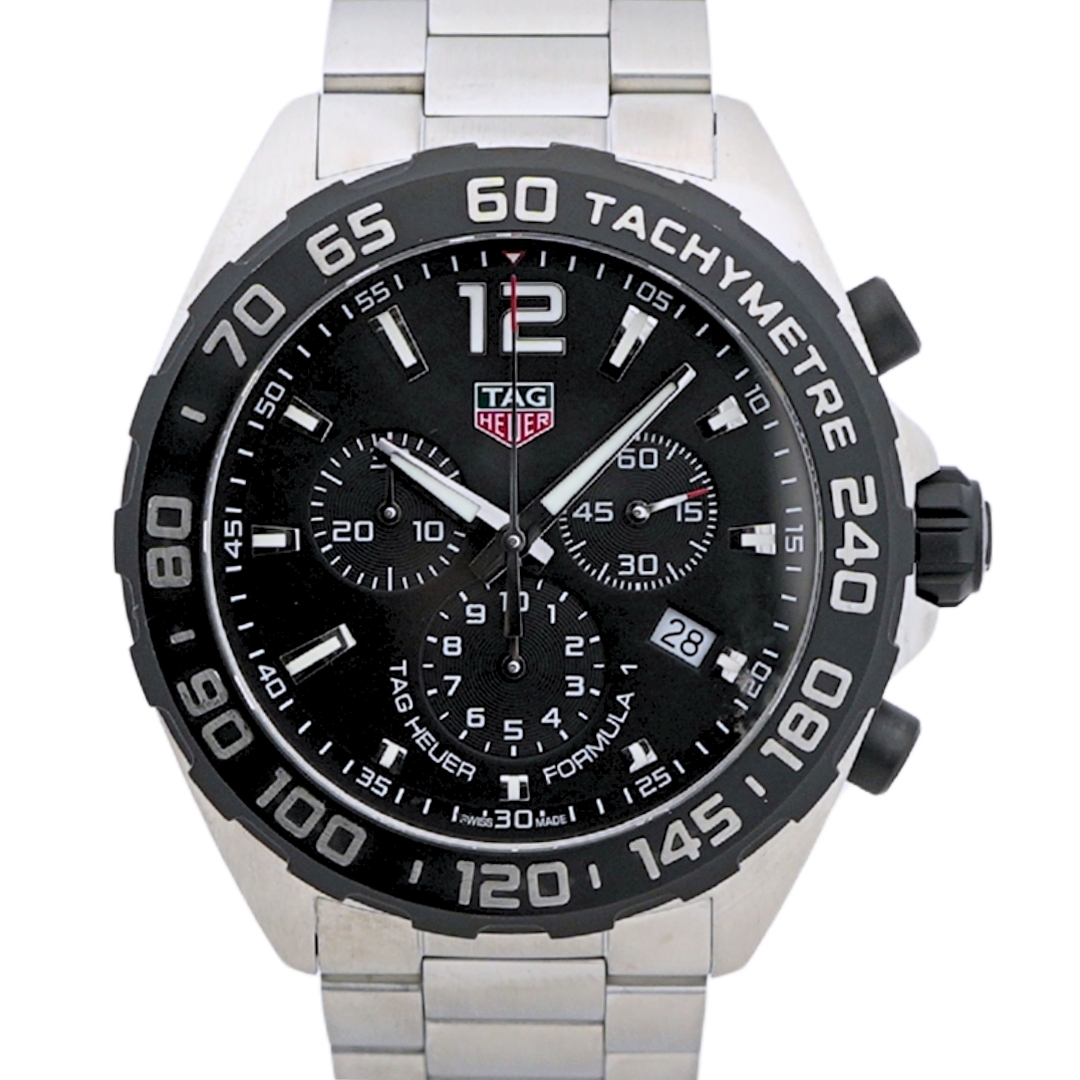 A Tag Heuer Formula 1 CAZ1010 is a bold and sporty chronograph built for precision, performance, and everyday durability. Crafted from stainless steel, this timepiece features a sleek black dial and a matching black fixed tachymeter bezel, creating a dynamic, monochrome, rugged, and refined look. The dial has three chronograph sub-dials, a date window at 4 o'clock, and luminous hands and markers, ensuring superb legibility in all lighting conditions. At 43mm, the case offers a commanding presence without compromising comfort.