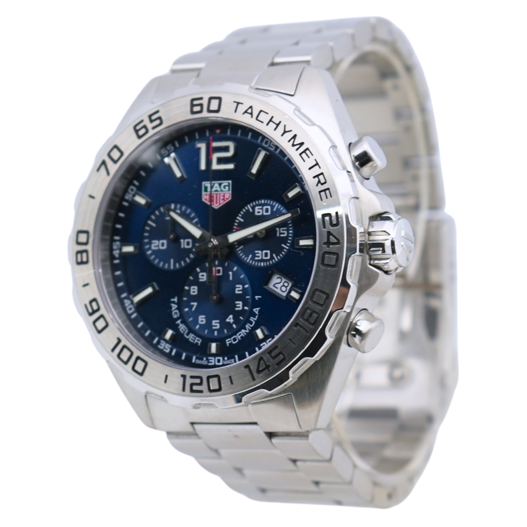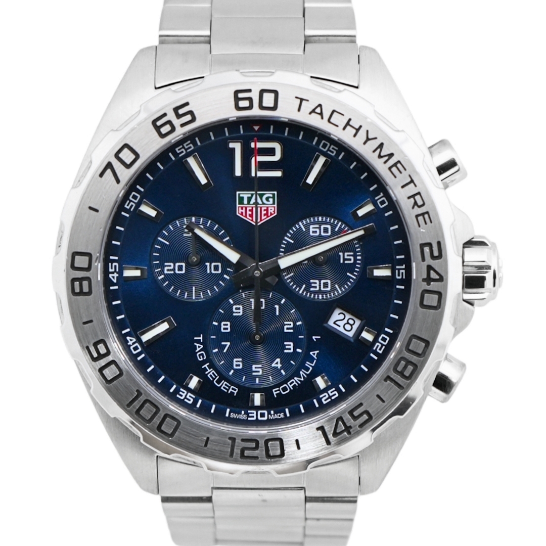 A Tag Heuer Formula 1 Chronograph represents a contemporary, motorsport-inspired timepiece that sits firmly within Tag Heuer’s most recognisable and commercially resilient collections. Crafted entirely from stainless steel, the 43mm case delivers a strong wrist presence while remaining versatile for everyday wear. The deep blue dial, framed by a tachymeter bezel, reinforces the Formula 1 lineage and offers immediate visual appeal that continues to resonate with modern collectors.