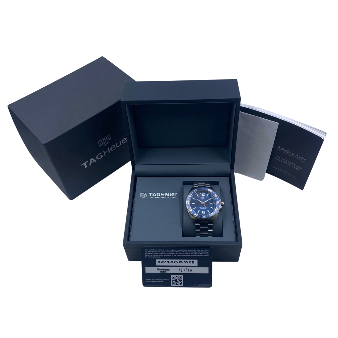A Tag Heuer Formula 1 WAZ1010 is an exceptional timepiece that combines sporty design with precise Swiss craftsmanship. Released in 2020, this model is crafted from durable stainless steel and features a striking blue bezel and dial, adding boldness and sophistication. The 43mm case size ensures a commanding presence on the wrist while remaining comfortable for daily wear. Its vivid blue accents stand out beautifully against the stainless steel, making it a perfect choice for those who appreciate both style and performance in their accessories.