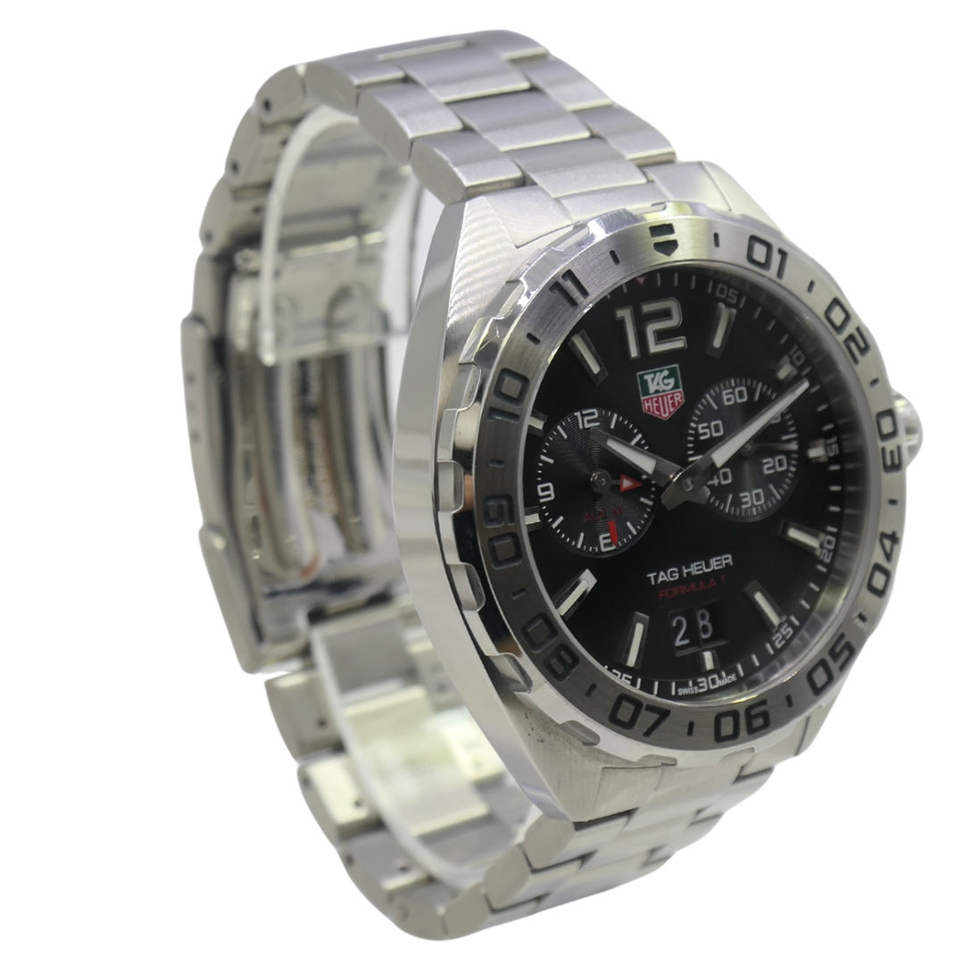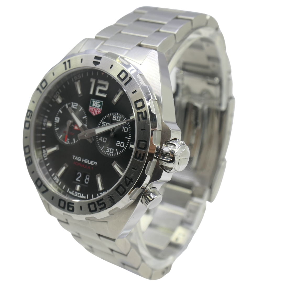 A Tag Heuer Formula 1 WAZ111A, a 2016 stainless steel timepiece with a sleek 41mm case and bold black dial, captures the spirit of motorsport-inspired luxury and precision.