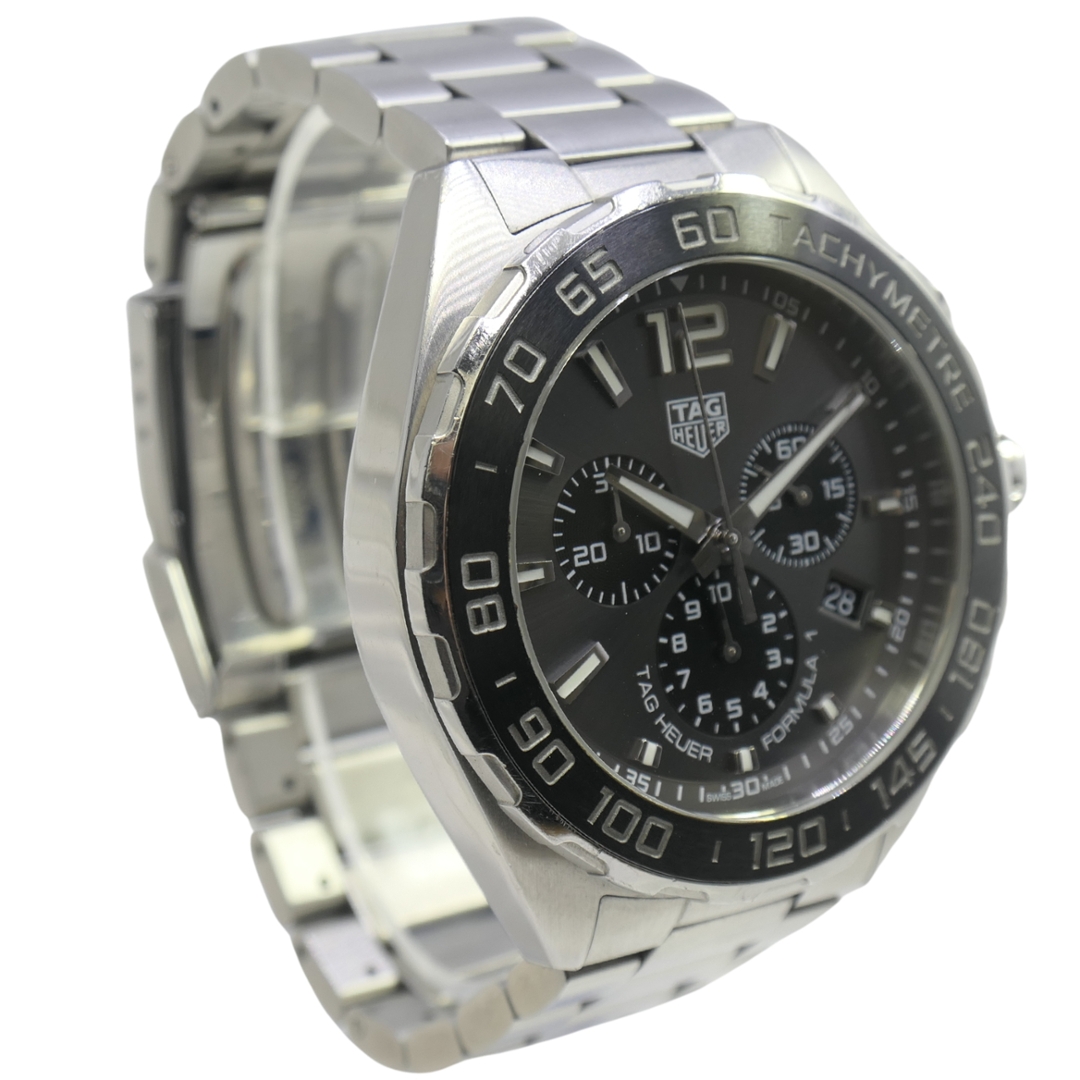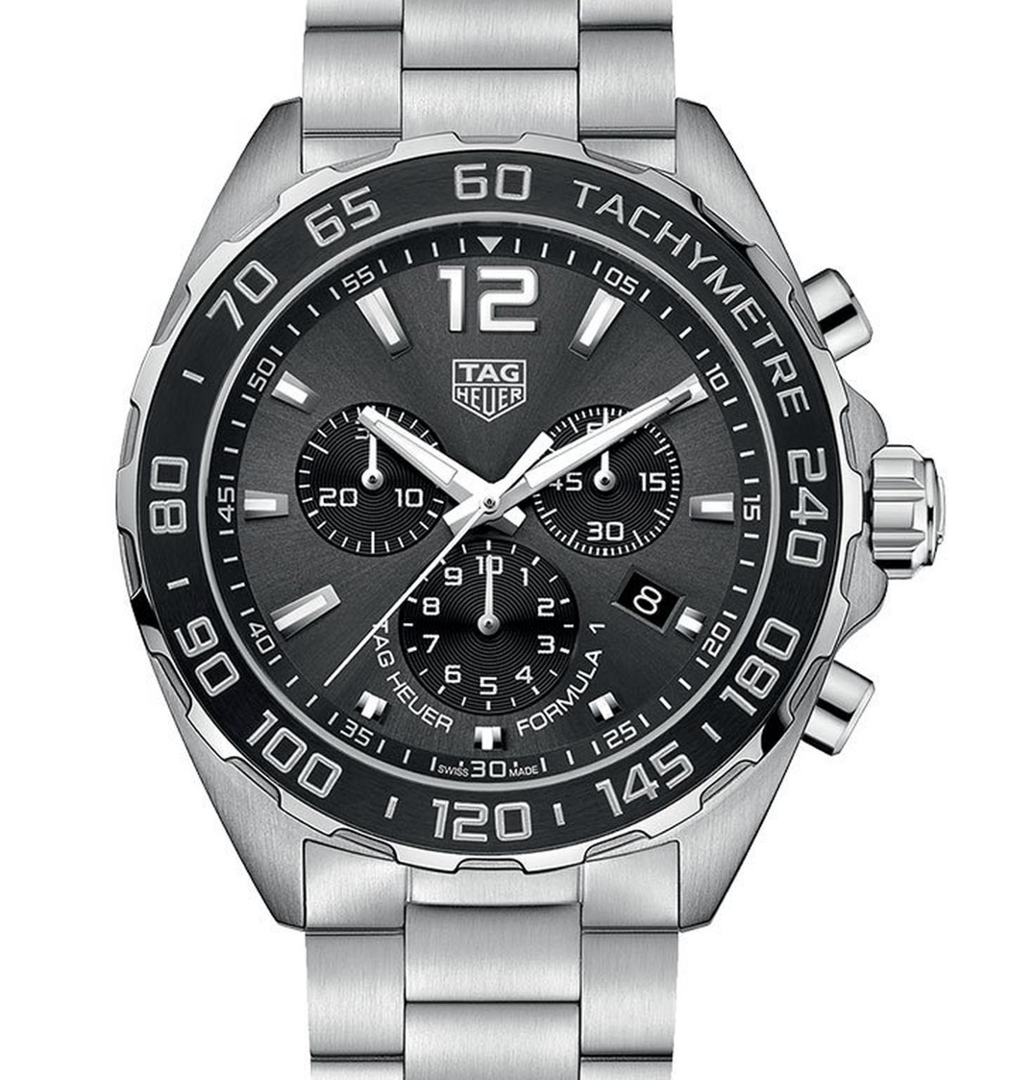 A Tag Heuer Formula 1 Watch, Stainless Steel with a Black Bezel & Grey Dial.