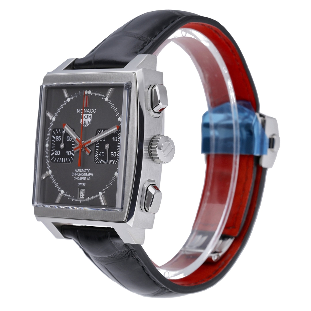 A Tag Heuer Monaco Calibre 12 Final Edition, model CAW211J, is a remarkable tribute to one of the most iconic chronographs in watchmaking history. Encased in its signature 39mm square stainless steel case, this final edition of the Calibre 12 series features a refined grey sunburst dial complemented by two black sub-dials and striking red accents, evoking the motorsport-inspired heritage of the Monaco line. The minimalist layout, combined with bold design cues, creates a perfect balance of elegance and performance.