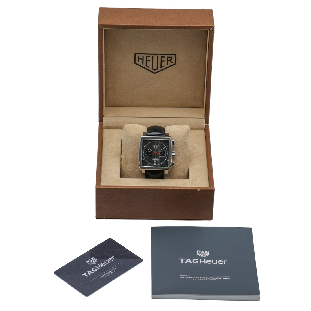 A Tag Heuer Monaco Calibre 12 Final Edition Watch, Black Leather Strap with a Stainless Steel Case & Clasp on a Grey Dial