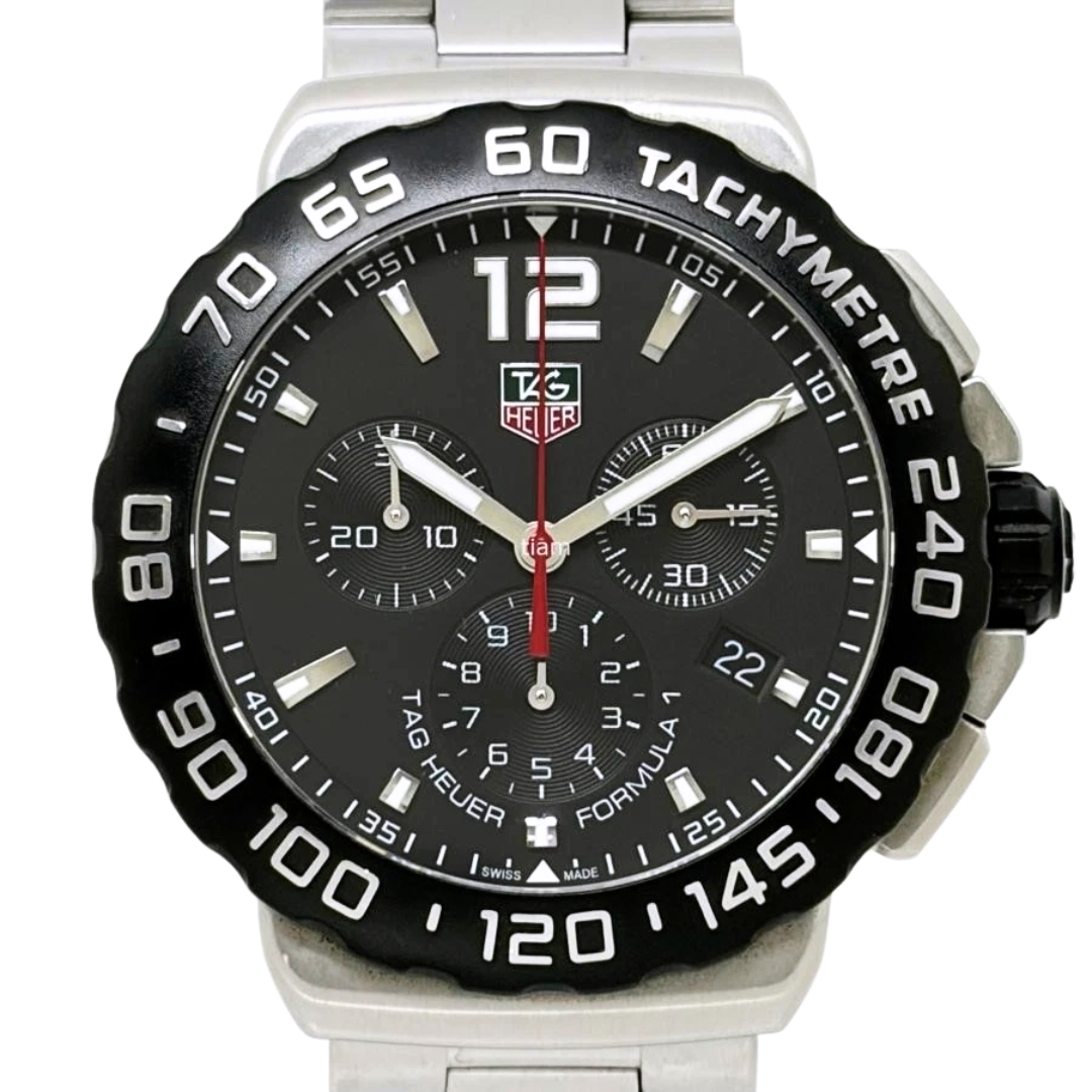 A Tag Heuer Formula 1 Watch is a striking Tag Heuer Formula 1 chronograph, reference CAU1110, presented in stainless steel with a bold black tachymeter bezel and matching dial. The 42mm case offers a strong wrist presence, complemented by luminous hour markers and hands for excellent legibility. The triple sub-dial layout delivers precise chronograph functionality, while the date display at 4 o’clock adds everyday practicality. The sporty aesthetic is unmistakably Tag Heuer, rooted in the brand’s deep connection to motorsport.