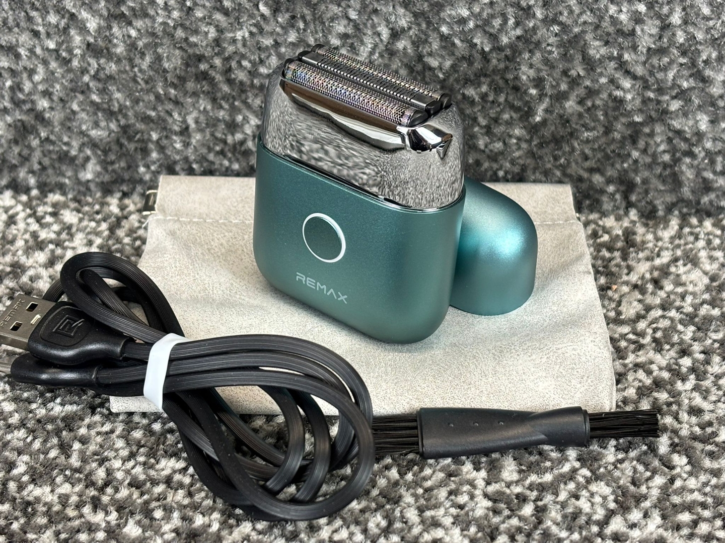 A brand new teal all-metal mini electric shaver designed for convenience, performance, and modern portability. Finished in a sleek metallic teal tone, this compact device offers a premium feel while remaining lightweight and easy to carry, making it ideal for travel, daily grooming, or on-the-go touch-ups. Its durable all-metal construction enhances both longevity and style.