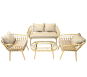 A 4 Piece Garden Furniture Set with Fire Pit Table which includes a three seat cushioned Sofa, two cushioned chairs and a Fire Pit Table.