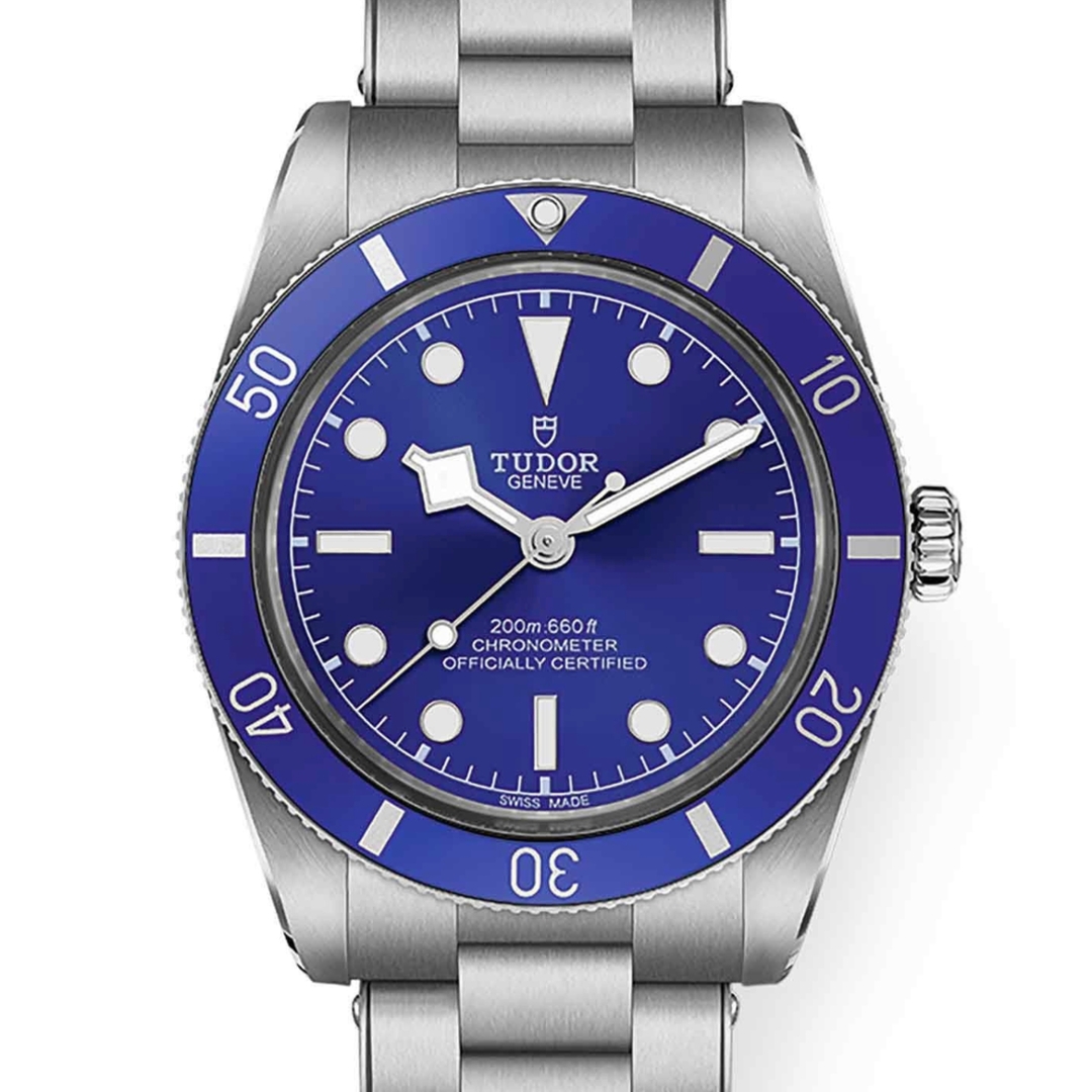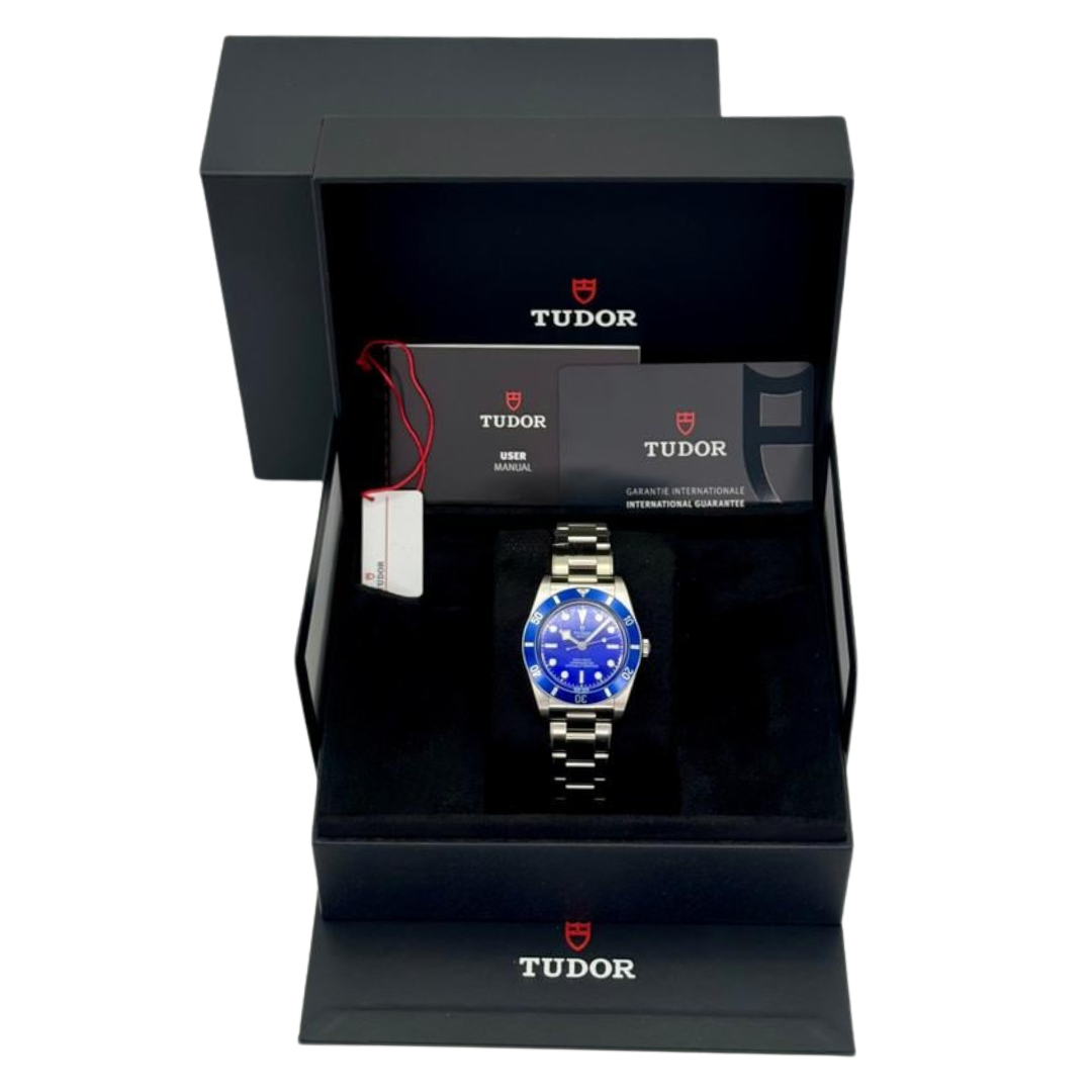 A Tudor Black Bay 54 reference M79000B-0001 in stainless steel, featuring a striking blue dial and matching bezel that bring a fresh, modern edge to this vintage-inspired diver. As the latest evolution of the Black Bay 54 line, this model retains the compact proportions of the original 1954 Tudor Submariner while introducing a more vibrant and contemporary aesthetic.