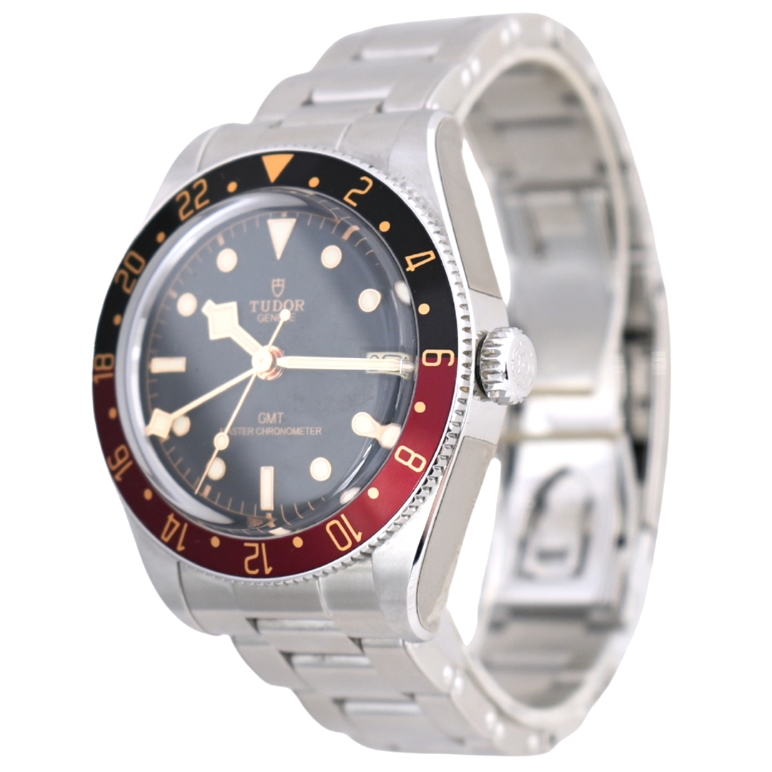 A Tudor Black Bay 58 GMT Watch, Stainless Steel with a Black & Red Bezel on a Black Dial.