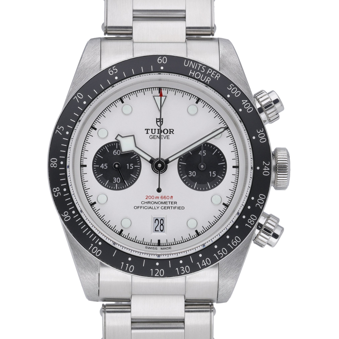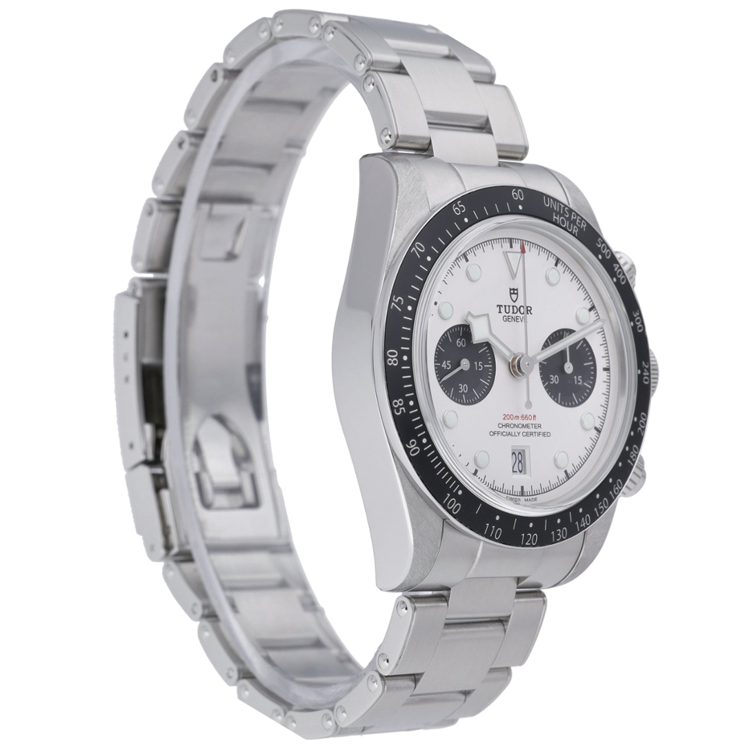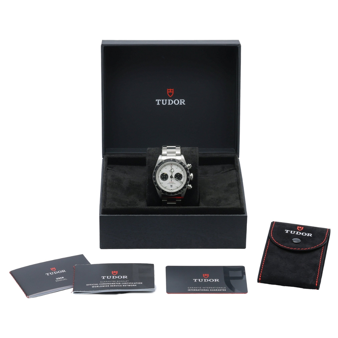 A Tudor Black Bay Chrono watch crafted in stainless steel, featuring a bold black fixed bezel and a crisp white dial—an iconic reverse-panda design that perfectly balances vintage inspiration with modern performance. Model number 79360N, this 2024 example is powered by the COSC-certified Calibre MT5813 automatic chronograph movement, developed in collaboration with Breitling, offering an impressive 70-hour power reserve and column-wheel precision. The 41mm case combines sportiness with classic proportions, maintaining Tudor’s robust and versatile aesthetic.