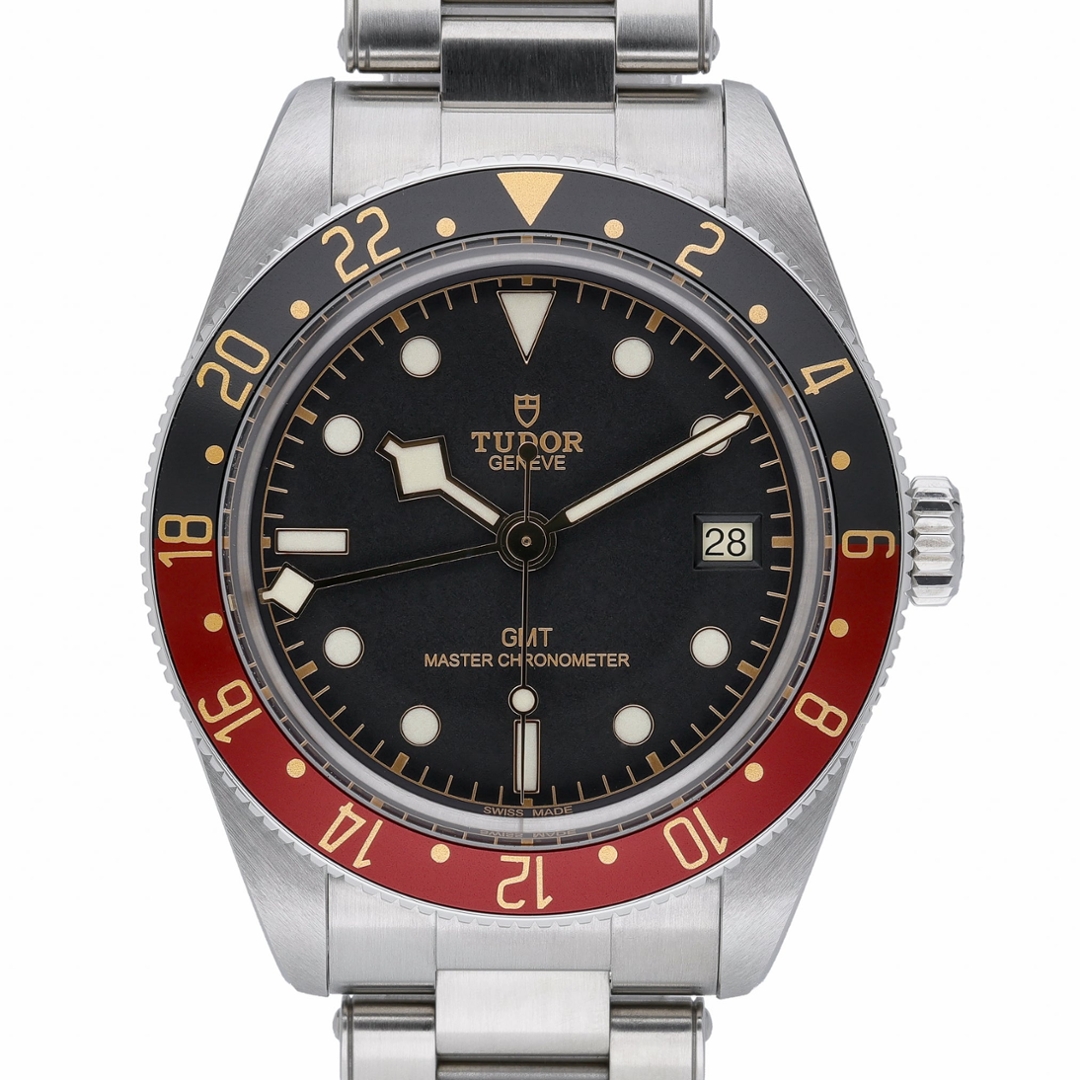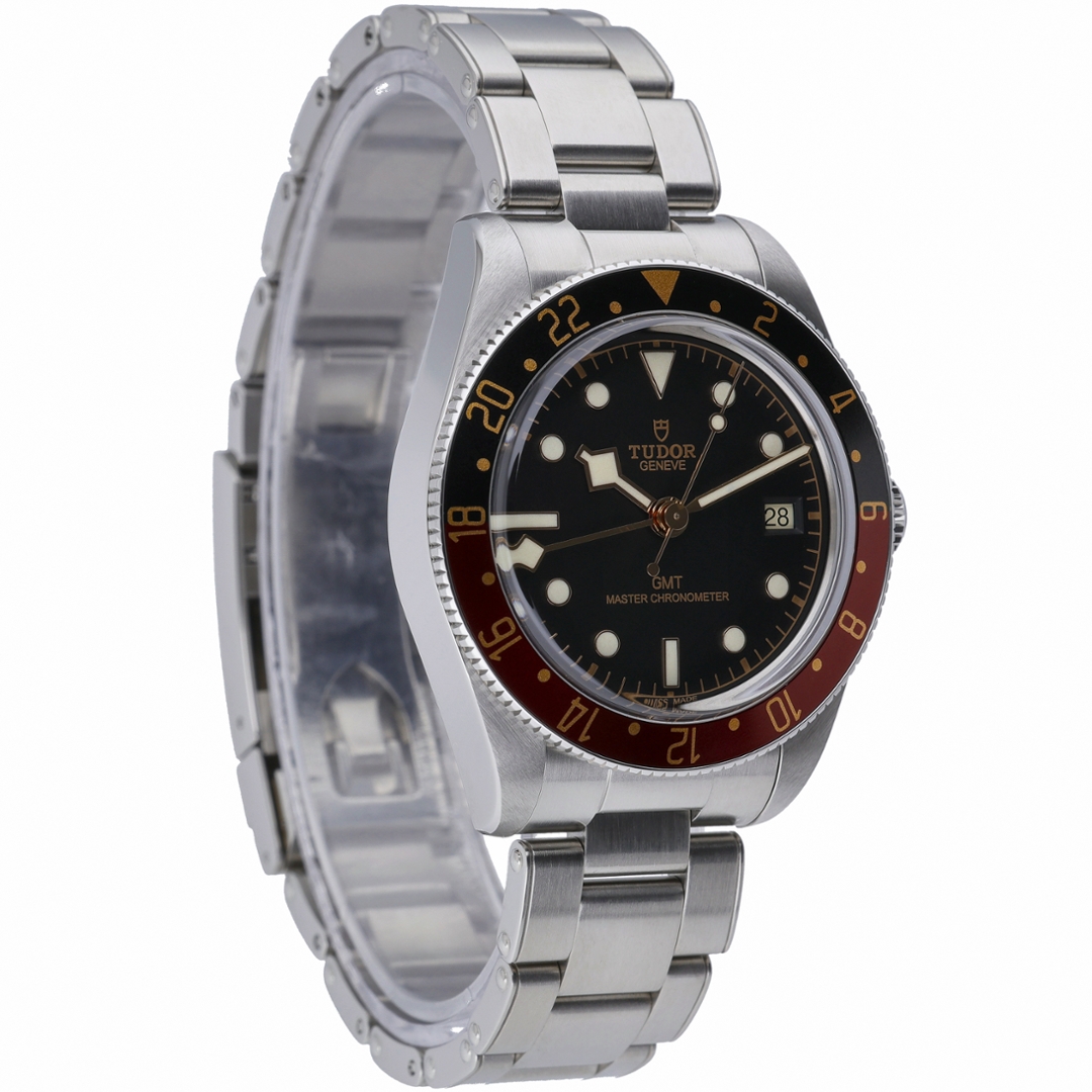A Tudor Black Bay GMT Watch, Stainless Steel with a Black & Red Bezel on a Black Dial.