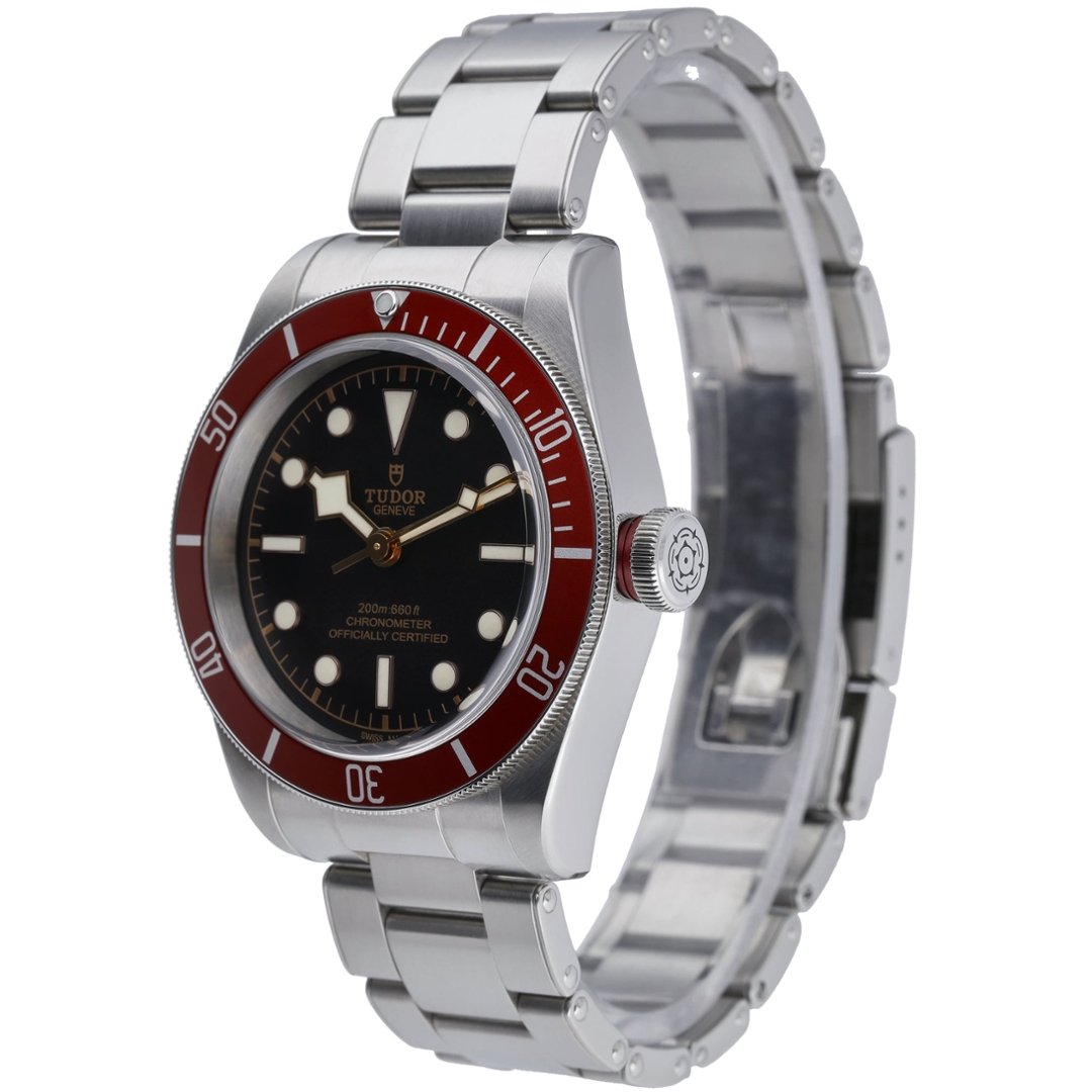 A Tudor Black Bay Watch, Stainless Steel with a Red Bezel and a Black Dial.