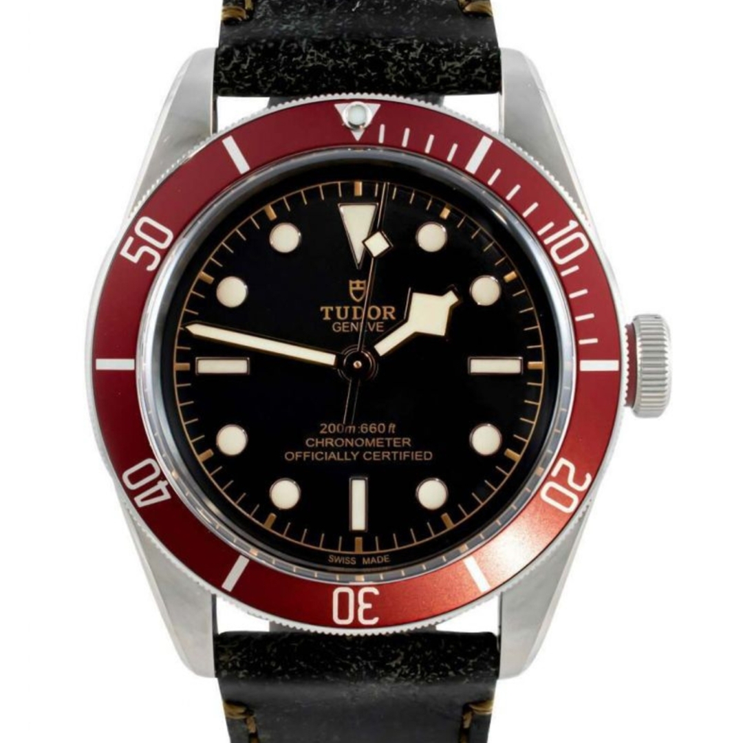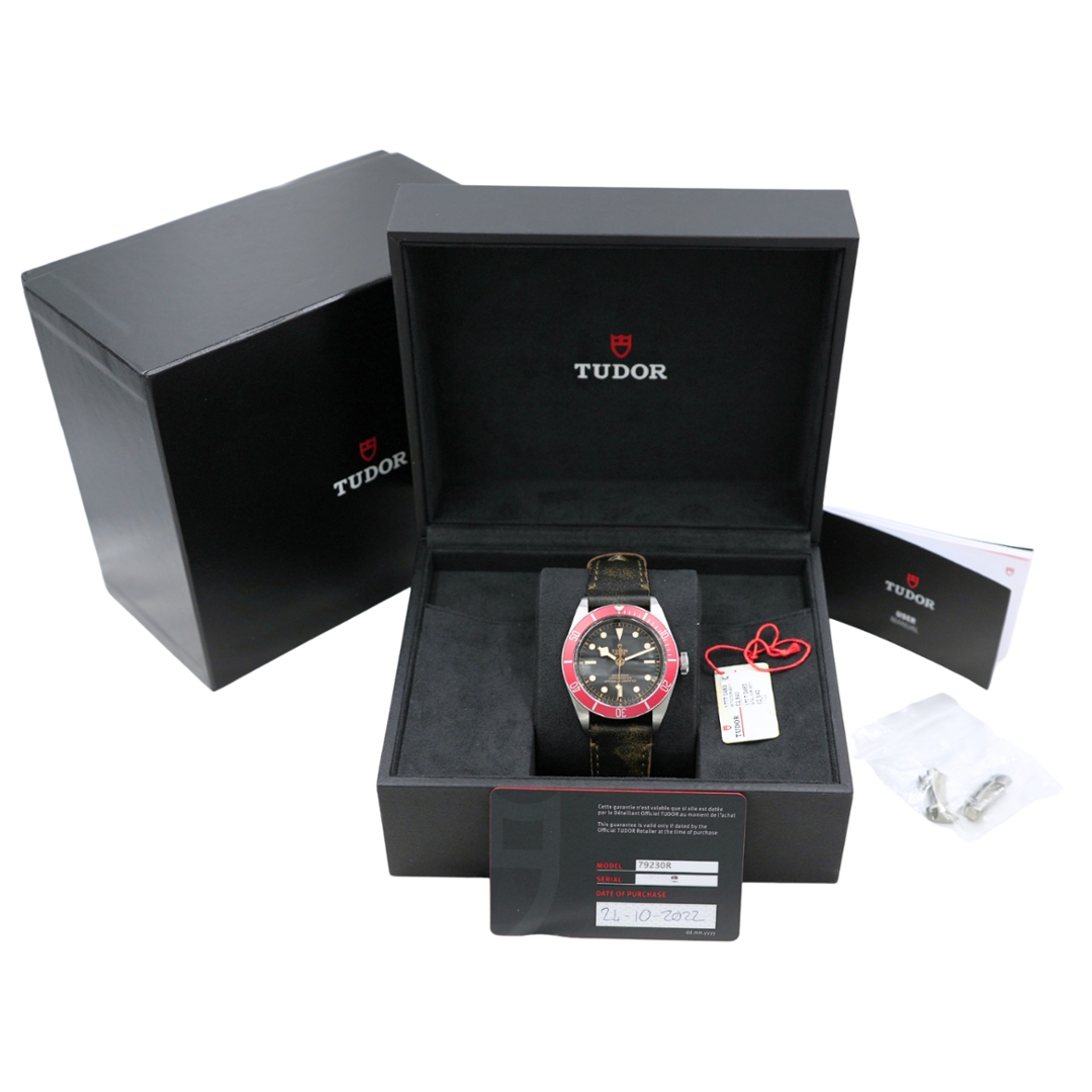 A 2022 Tudor Black Bay 79230R in stainless steel, featuring the signature red unidirectional bezel and a deep black dial. The 41mm case delivers strong wrist presence, complemented by the domed crystal and bold snowflake hands that reference Tudor’s historic dive watches. Luminous hour markers ensure excellent legibility, while the overall design balances vintage inspiration with modern robustness.