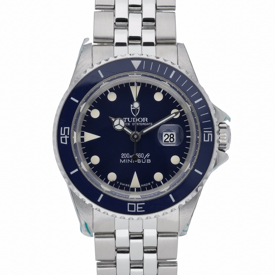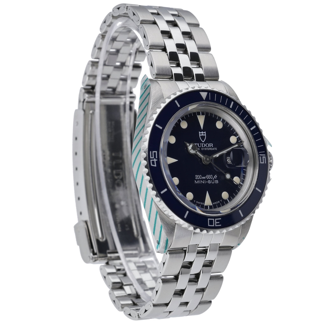 A Tudor Prince Date Submariner, model 73090, presented in stainless steel with a blue bezel and matching dial, offering a classic, highly collectable vintage dive-watch aesthetic. The 33mm case delivers a more compact and refined wrist presence, while retaining the robust design language associated with Tudor’s Submariner line. The dial features luminous hour markers and signature Mercedes-style hands for excellent legibility, alongside a date display at 3 o’clock with Cyclops magnification.