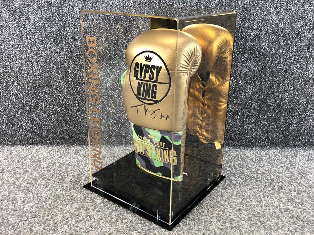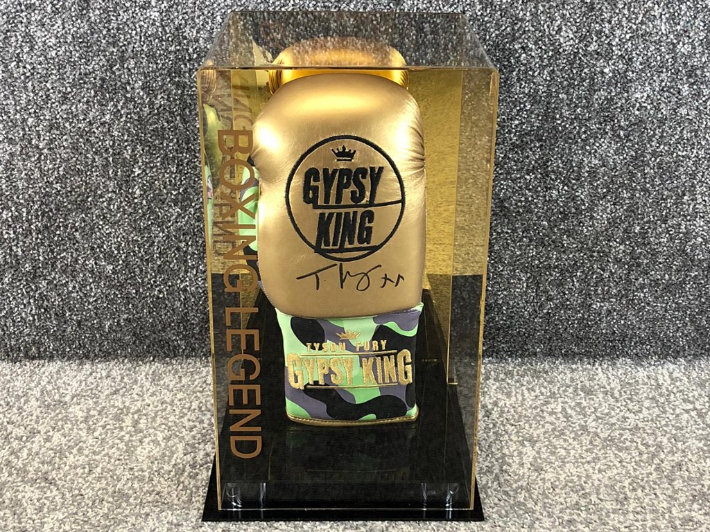 A signed and authenticated Tyson Fury Gold & Camo Boxing Glove in a presentation case. Approx 15" height, 9" width.