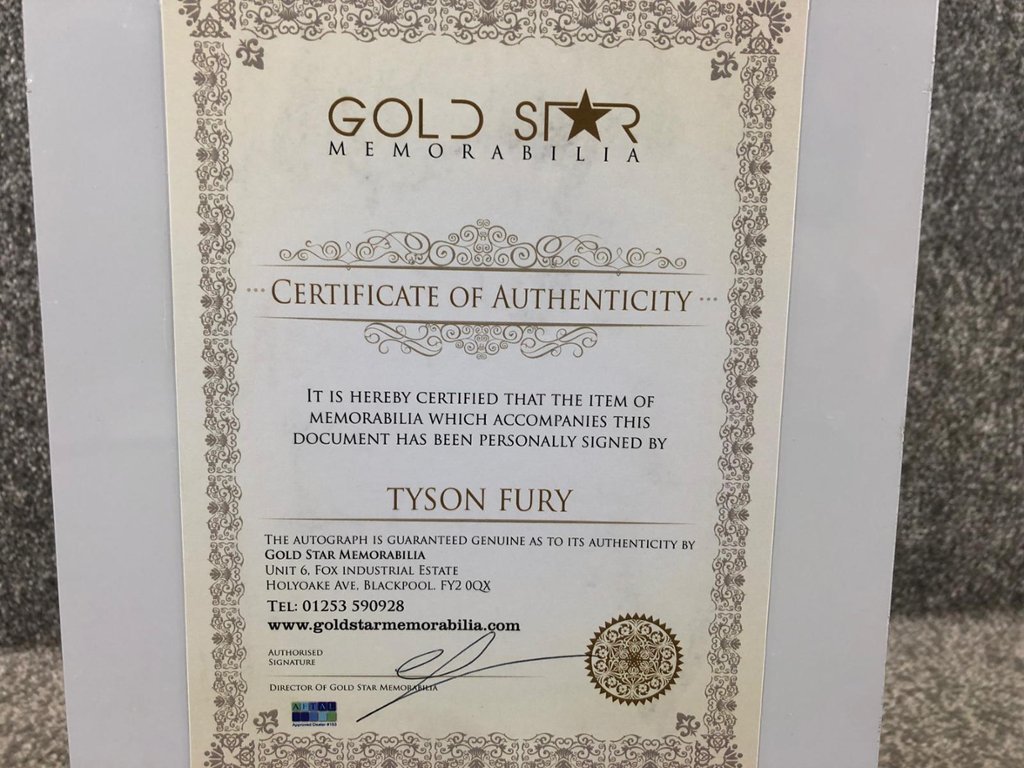 A signed and authenticated boxing glove by Tyson Fury, one of the most dominant and charismatic figures in modern heavyweight boxing. Known as the “Gypsy King,” Fury’s achievements in the ring and his larger-than-life personality have made him a global sporting icon, ensuring memorabilia such as this remains highly desirable among collectors.