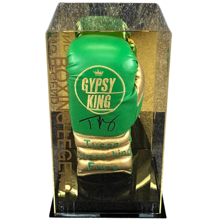 Whether displayed as a centrepiece or as part of a larger collection, the signed and authenticated Tyson Fury green & gold boxing glove serves as a testament to Fury's talent, dedication, and success in the boxing world. It is a prized possession for fans and collectors alike, symbolizing the greatness of one of boxing's most iconic figures.
