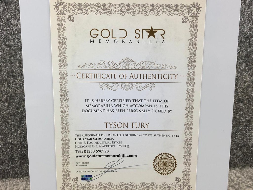 Tyson Fury's autograph on the boxing glove not only adds to its authenticity but also elevates its value as a collectable item. Authenticated to guarantee its genuineness, this glove represents a tangible connection to Fury's illustrious boxing career and accomplishments.