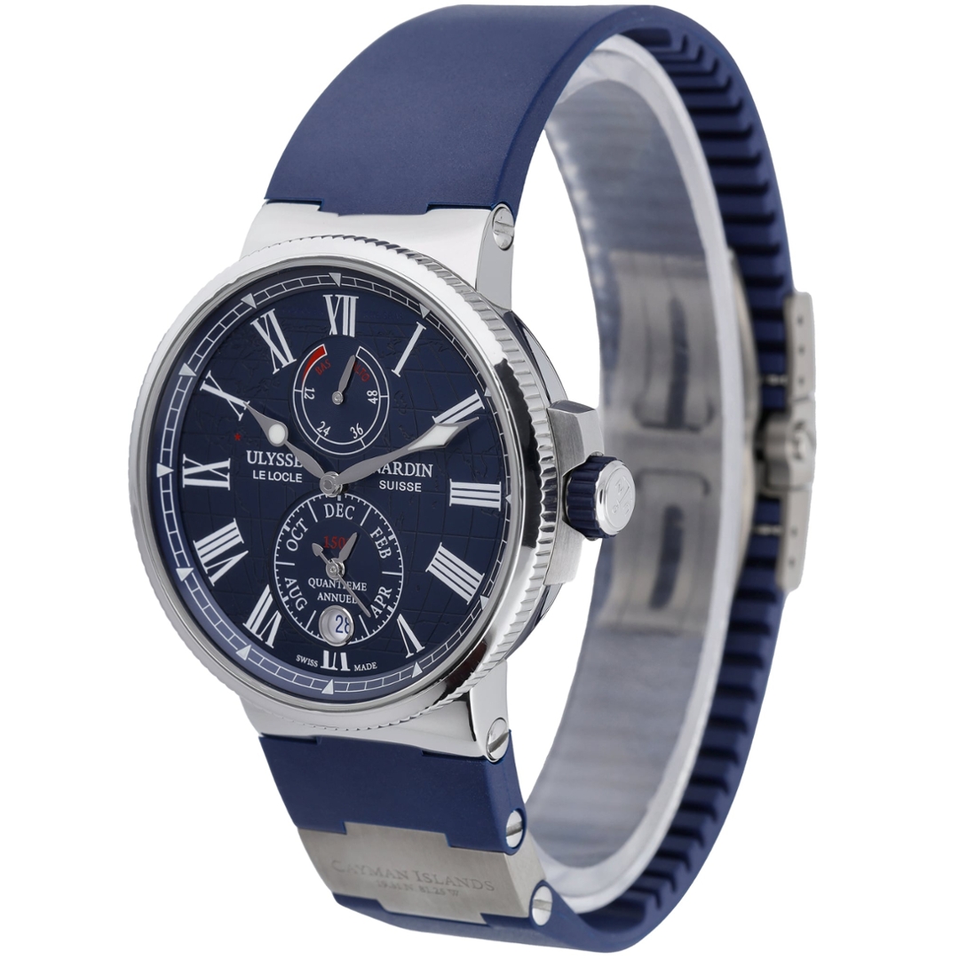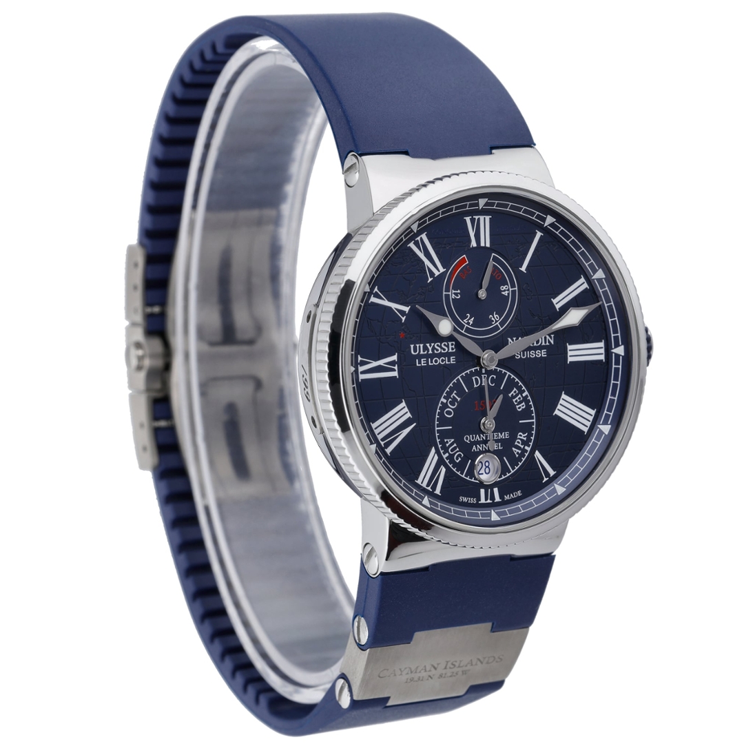 A Ulysse Nardin Marine Chronometer combines modern sport styling with the brand’s long-standing maritime heritage. The 43mm stainless steel case is paired with a blue rubber strap and matching clasp, framing a richly detailed blue dial with Roman numerals and a world-map motif.