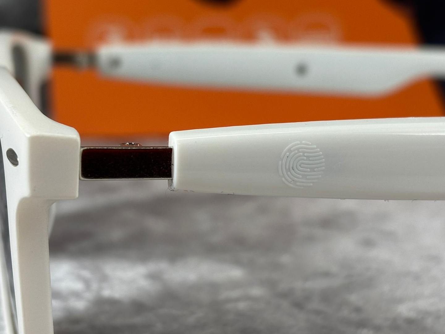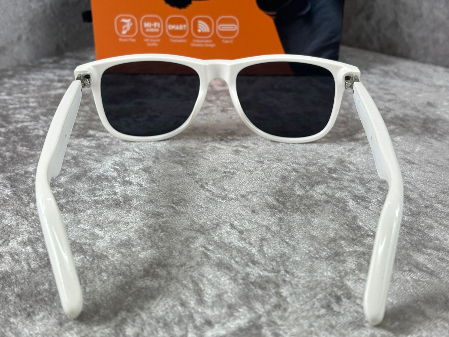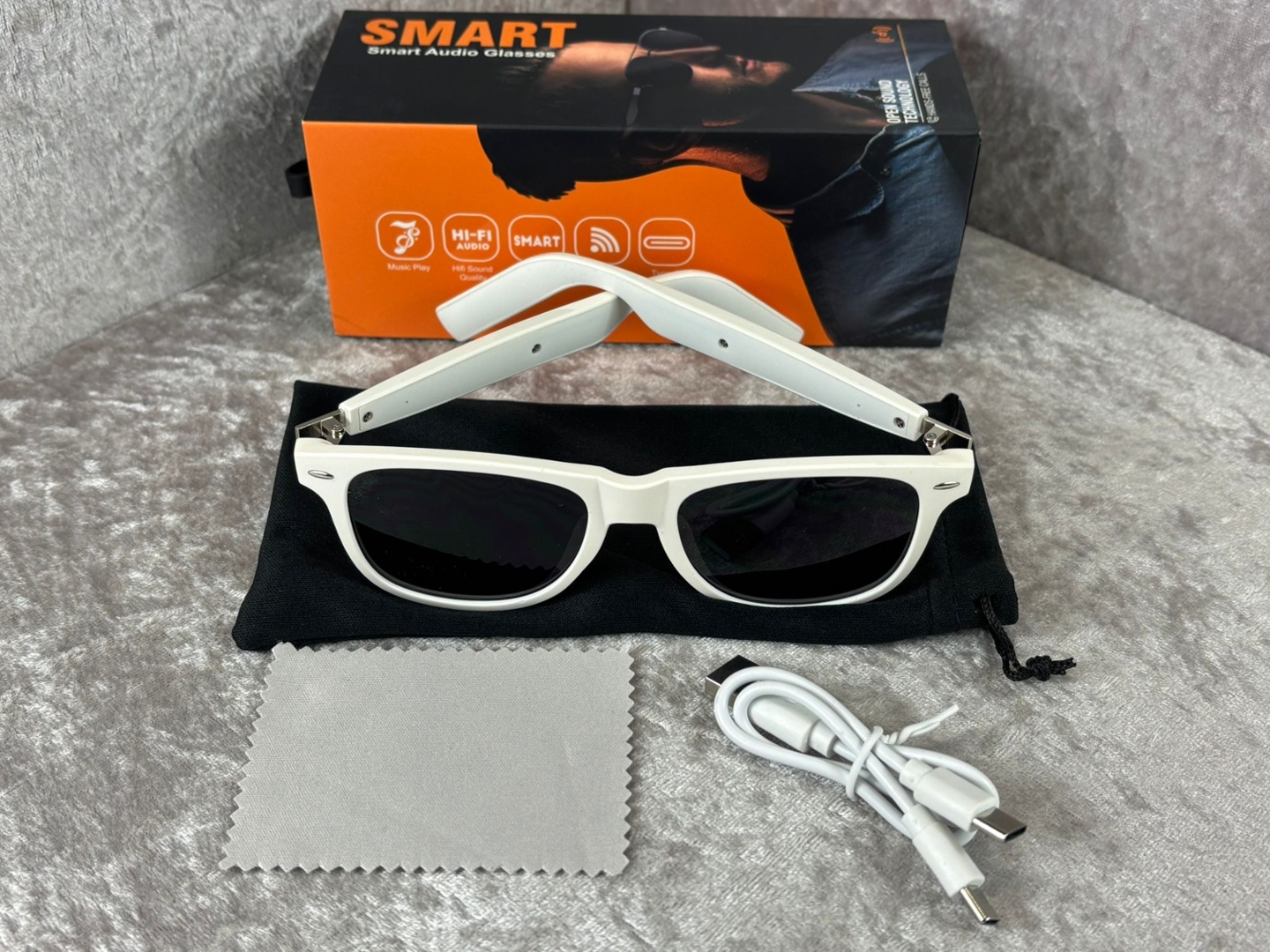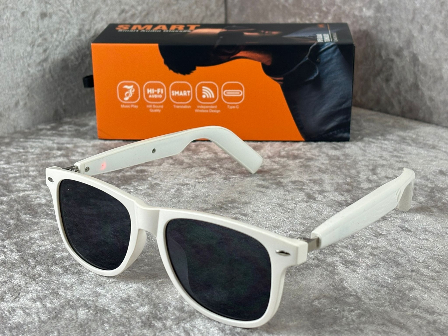 A brand new, unused and boxed pair of white smart glasses combining a classic sunglass design with hands-free audio, built-in call functionality, open-ear sound, and intuitive controls for everyday convenience and on-the-go use.