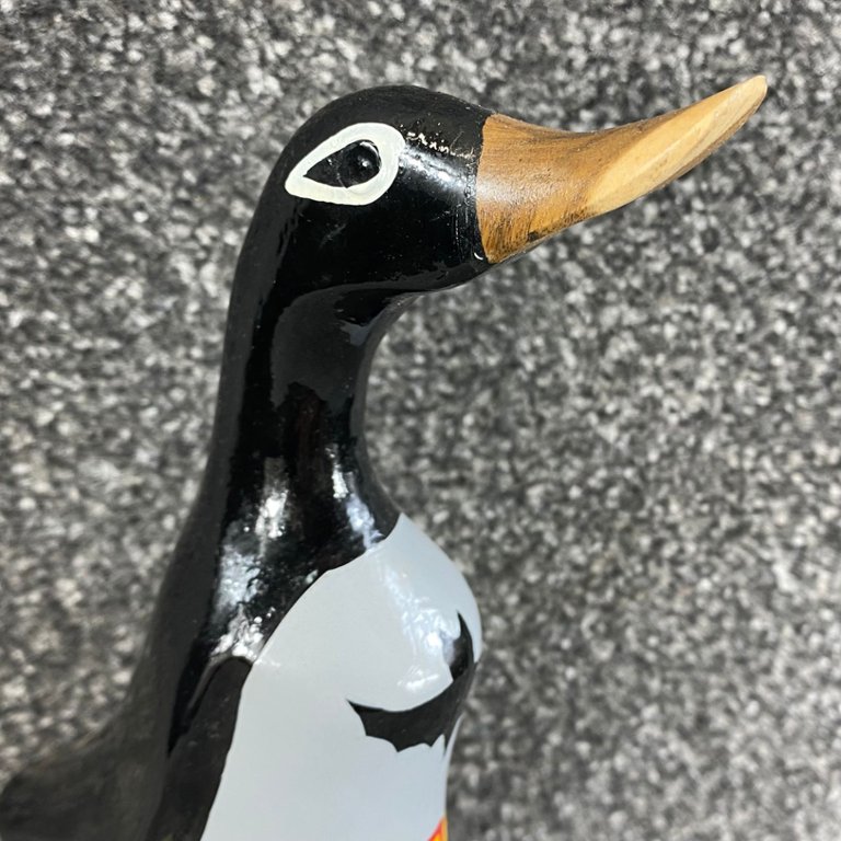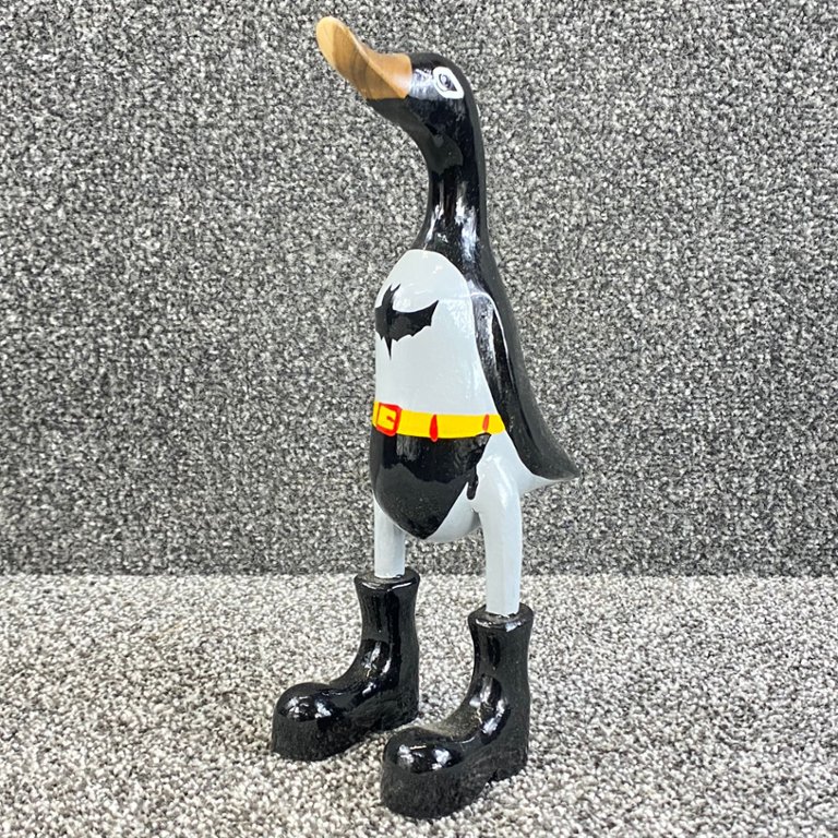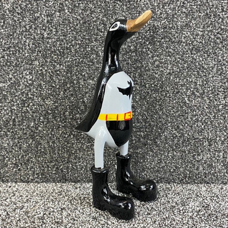 Behold the whimsical fusion of two iconic characters in this hand-carved and painted wooden sculpture of BatDuck. Standing approximately 11 inches in height, with a width and depth of 4 inches, this delightful artwork combines the adventurous spirit of Batman with the charm of everyone's favourite superhero duck.