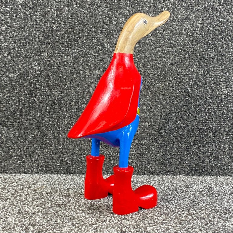 Crafted with meticulous attention to detail, the wooden sculpture showcases SuperDuck in a dynamic pose, ready to leap into action and save the day. From the determined expression on his face to the fluttering cape billowing behind him, every aspect of his heroic persona is rendered with lifelike precision.