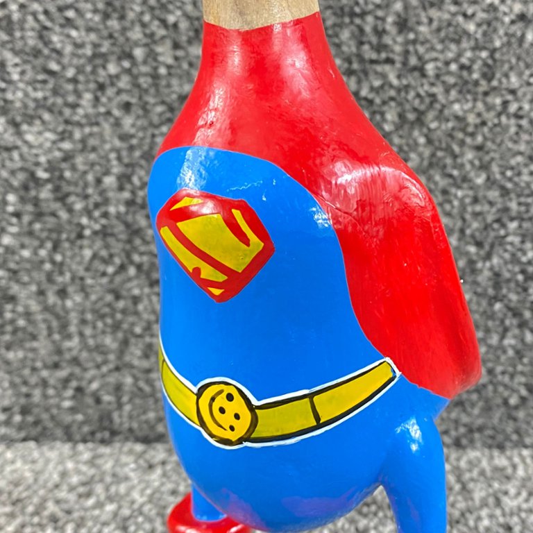 Hand-carved and painted with vibrant colours, the sculpture exudes a sense of whimsy and joy, inviting viewers to embrace their inner superhero and embark on imaginative adventures. Whether displayed as a centrepiece on a shelf, a focal point on a desk, or as a cherished addition to a collection, it brings a touch of lighthearted fun to any space.