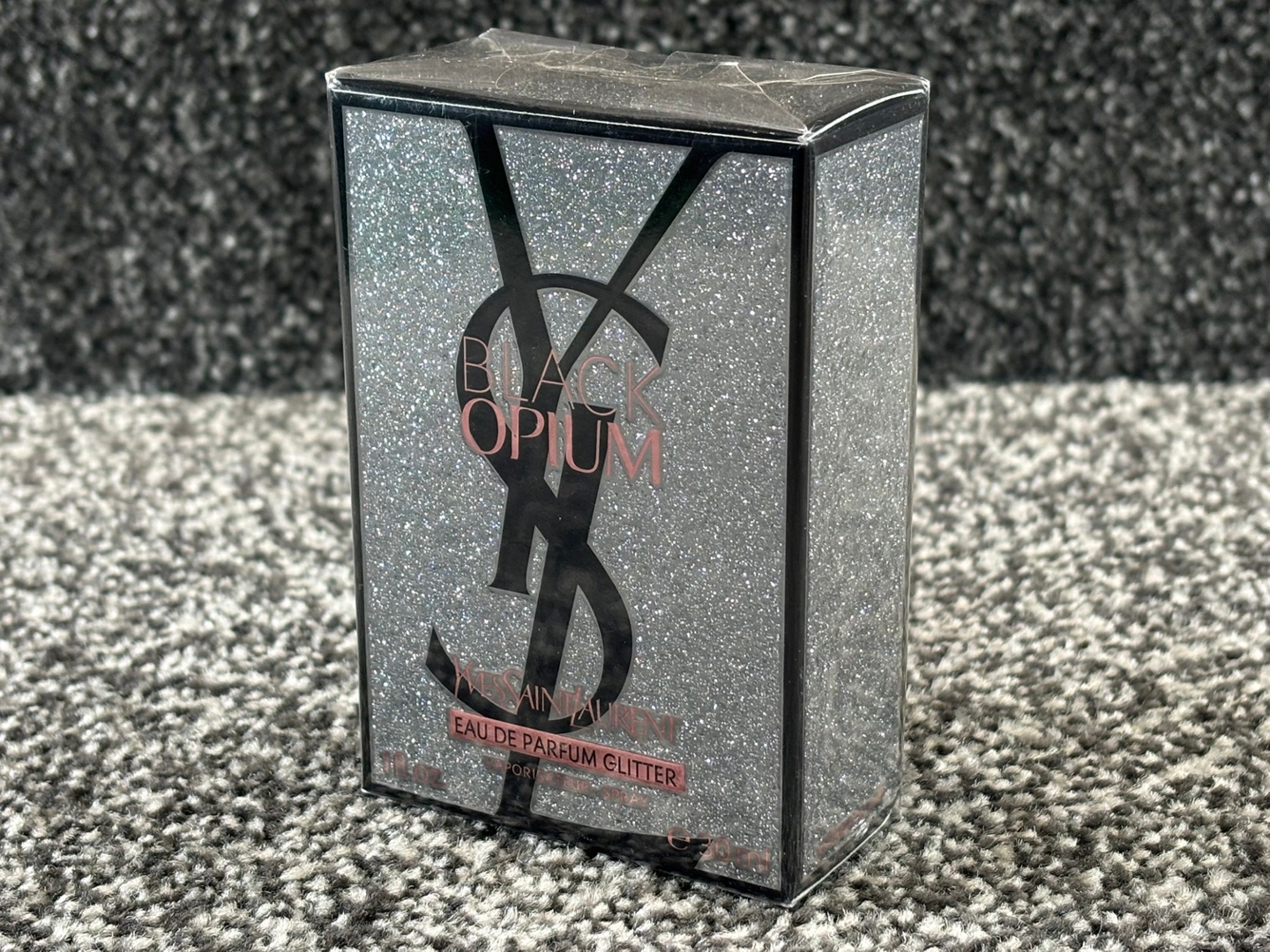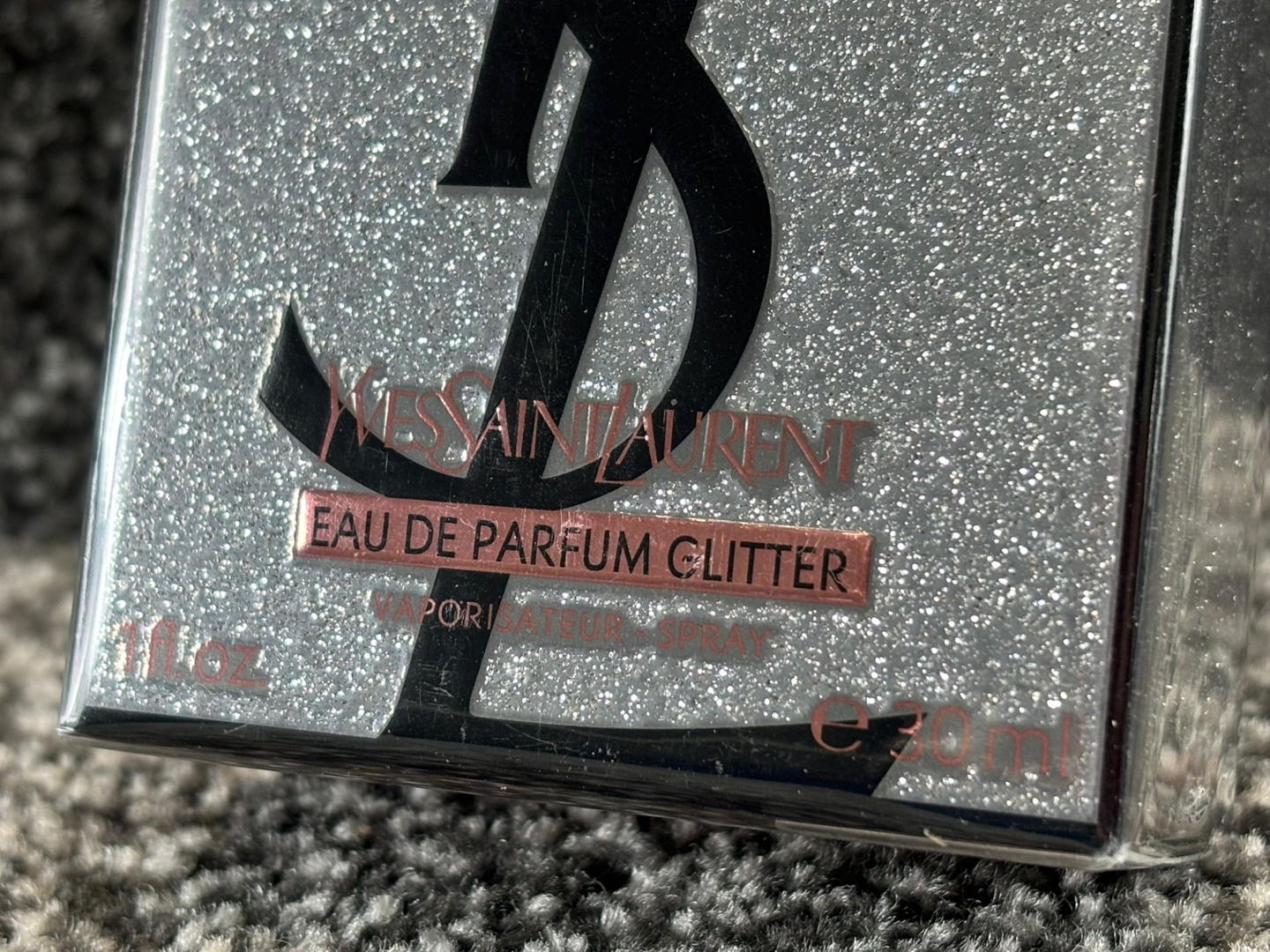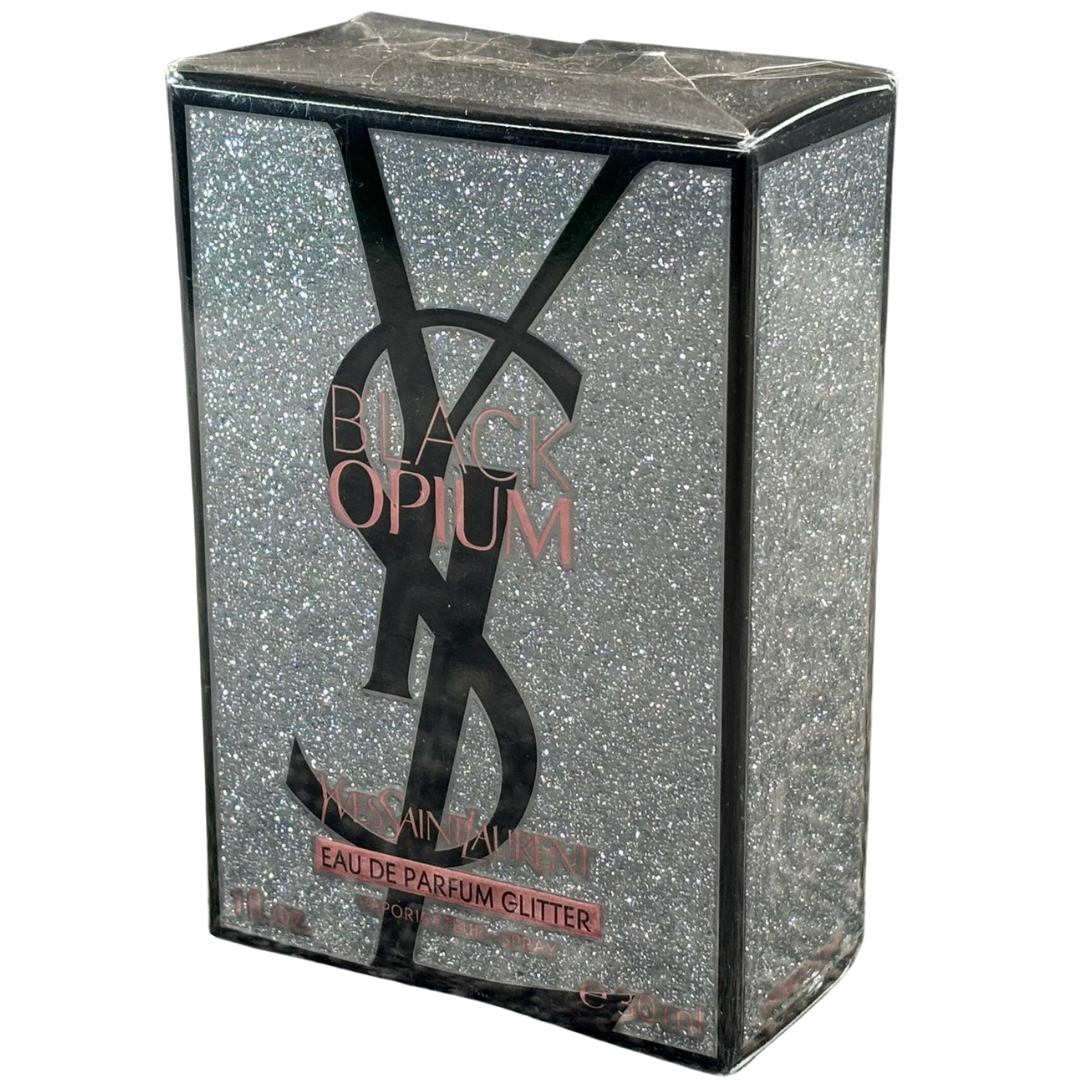 A 30ml bottle of YSL Black Opium Eau De Parfum Glitter, presented in its original presentation box and offering a radiant, glamorous interpretation of the iconic Black Opium fragrance. This sparkling edition retains the bold attitude of the original while introducing a lighter, more luminous character.