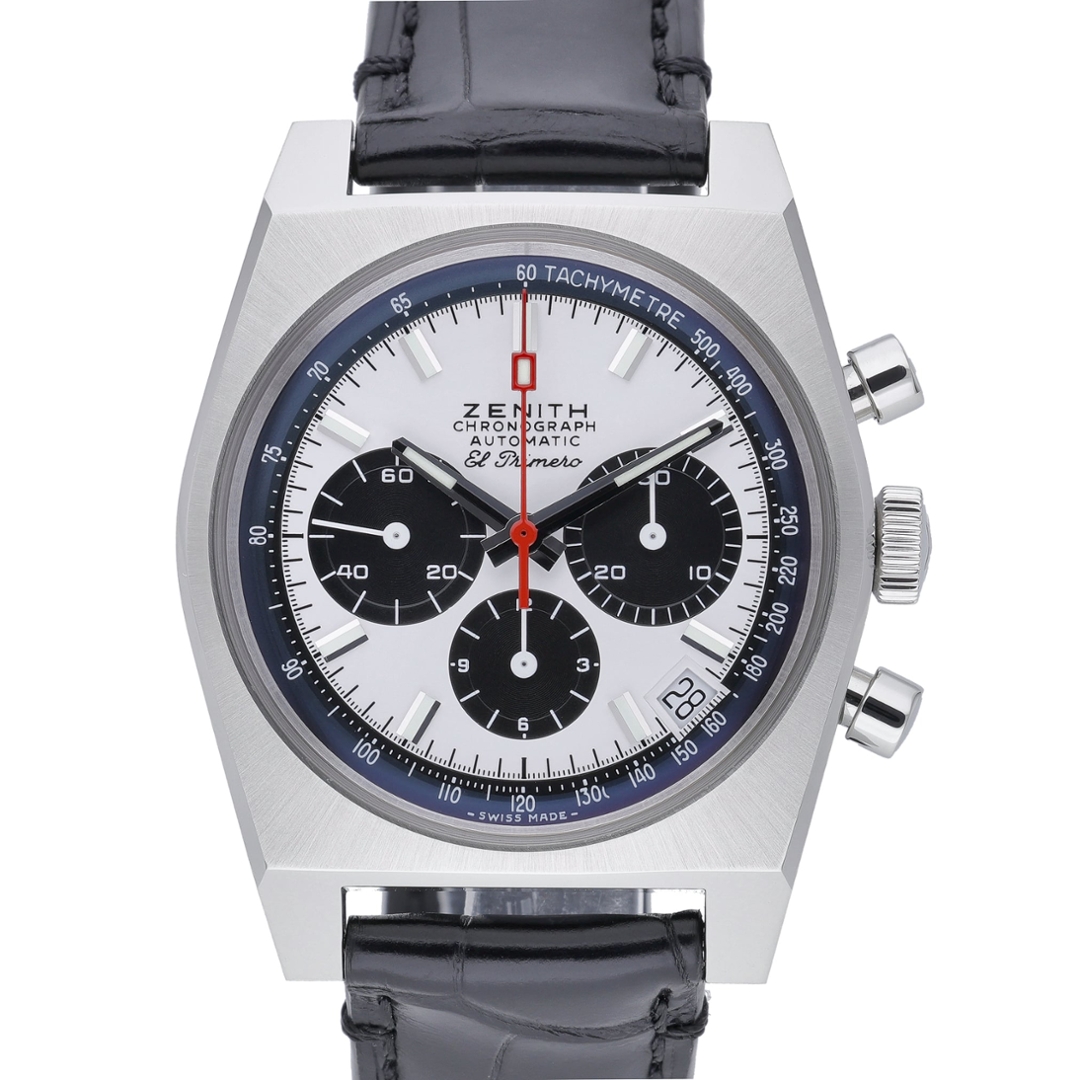 A Zenith El Primero reference 03.A384.400/21.C815, presented with a stainless steel case and matching clasp, paired with a black leather strap. The distinctive 37mm tonneau-shaped case is complemented by a crisp white dial featuring contrasting black sub-dials, a red central chronograph seconds hand, and a tachymeter scale around the perimeter, staying true to the iconic A384 design.